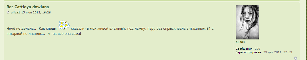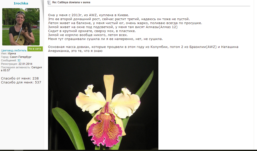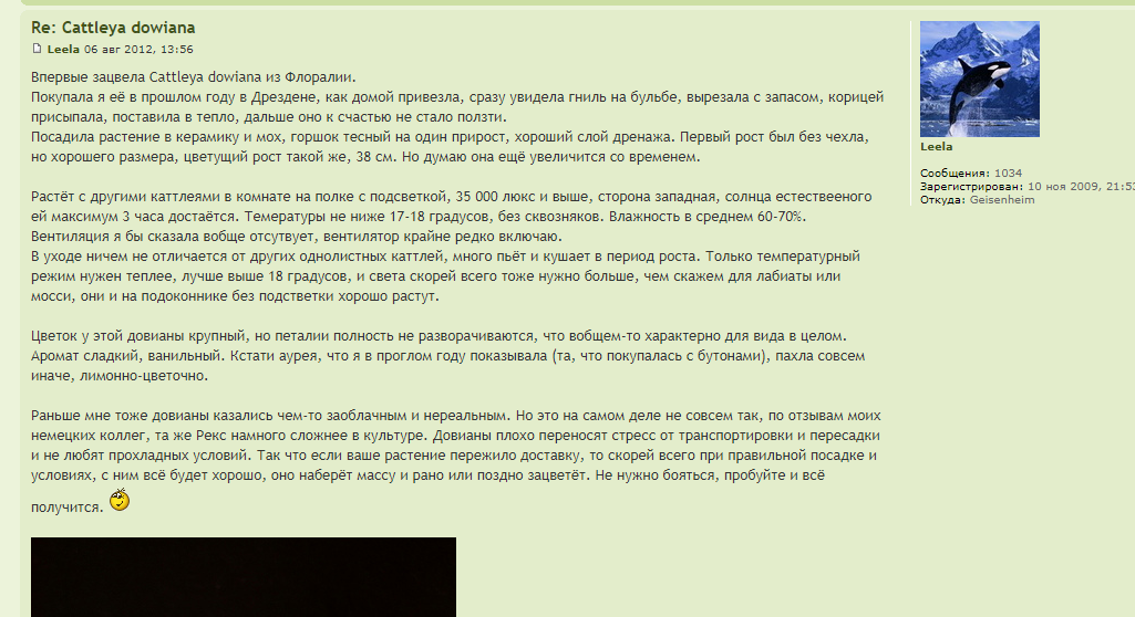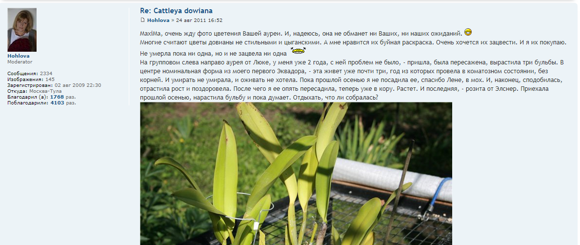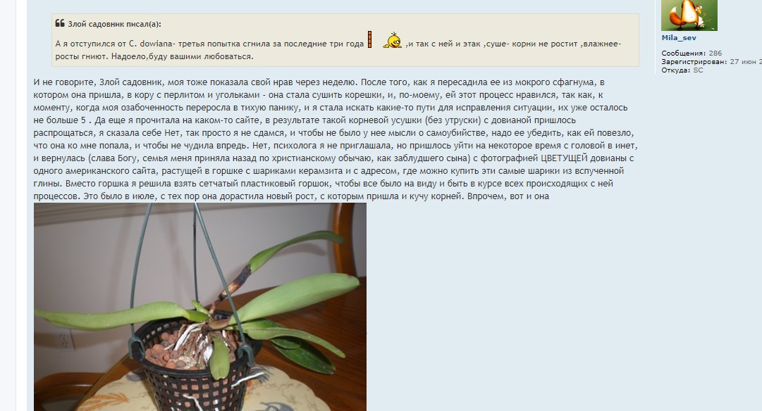 Вот тут http://www.ruorchids.ru/fora/viewtopic.php?t=61 можно увидеть результаты, а точнее отсутствие их у тех кто пытался следовать бреду Артура Чедвика . И что интересно он сам пишет что у него гибнет куча довиан благодаря его бреду и никого это не смущает. Как видно выше результат и без проблем получили именно те кто не повелся на этот бред и сажал в мох сфагнум. Думаю любому понятно что корни в мху сфагнуме быстро просыхать не могут. Но зато и нет никаких ДОВИАНОВЫХ ГНИЛЕЙ. Понятно что поливать нужно с просушкой … но не так как пишет он. Напомню : субстрат должен быть влагоемким и держать влагу хотя б неделю минимум а потом просохнуть она постоять 3 дня сухой и потом опять нормальный полив, а не посадка в корзины в не влагоемкий субстрат ( пенопласт, кору которая не берет и не держит влаги) и что б она просыхала за пару часов а потом стояла сухой что и ведет к их гибели (или частые поливы потому что она быстро просыхает это тоже ведет к тому же результату) . ТАК ЖЕ ВЕДЕТ К ЭТОМУ РЕЗУЛЬТАТУ РИЗОМА НЕ ПРИКРЫТАЯ СУБСТРАТОМ!!