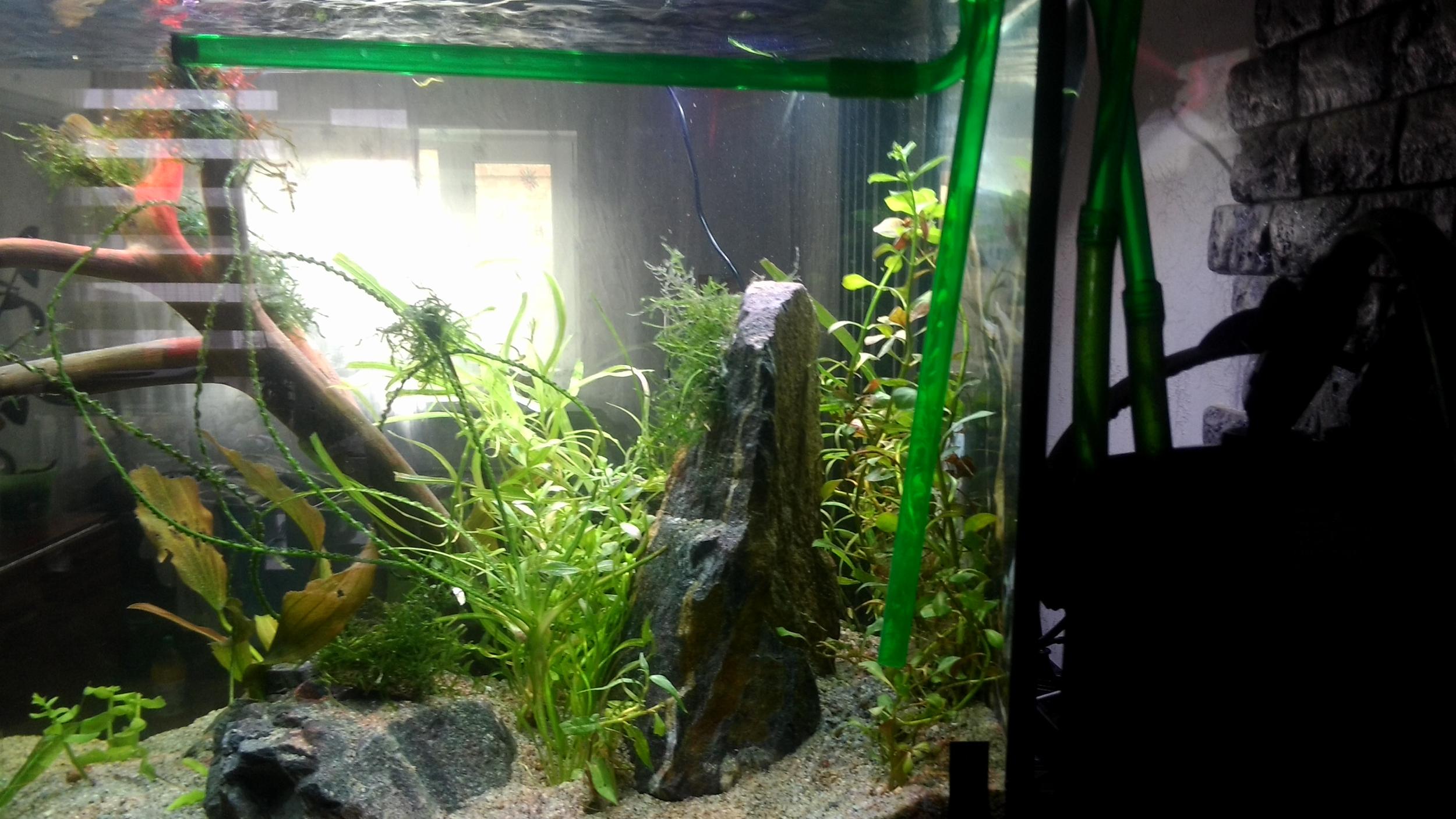 Заборную сетку нужно одеть обязательно, трубку можно подпилить. Откуда нитраты такие высокие? Из цихлидника?  рыб я бы запускал. Как-то коряга мне не очень нравится - хотя бы места спила задекорировать мохом, например. Кстати мох лучше поплотней наматывать, а торчащие веточки обрезать, чтобы они как космы не болтались.