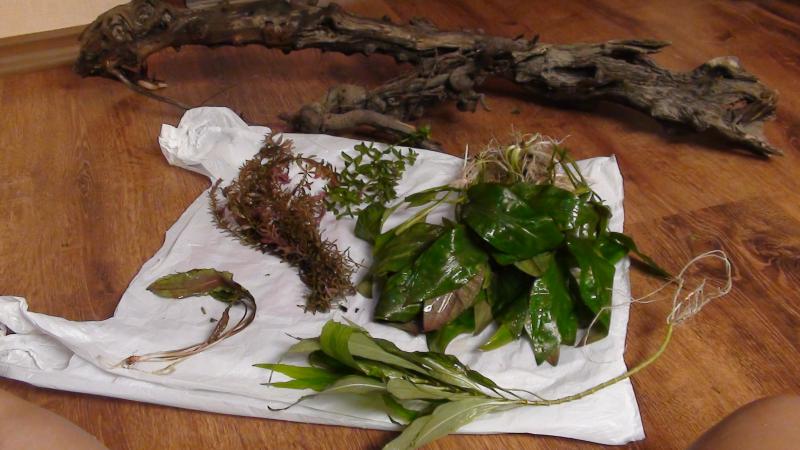 Растения: крипты, папоротник, моноселениум, еще какой-то мох на коряге, не попавший на фото, похож на яванский