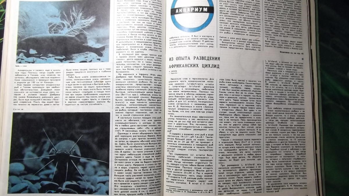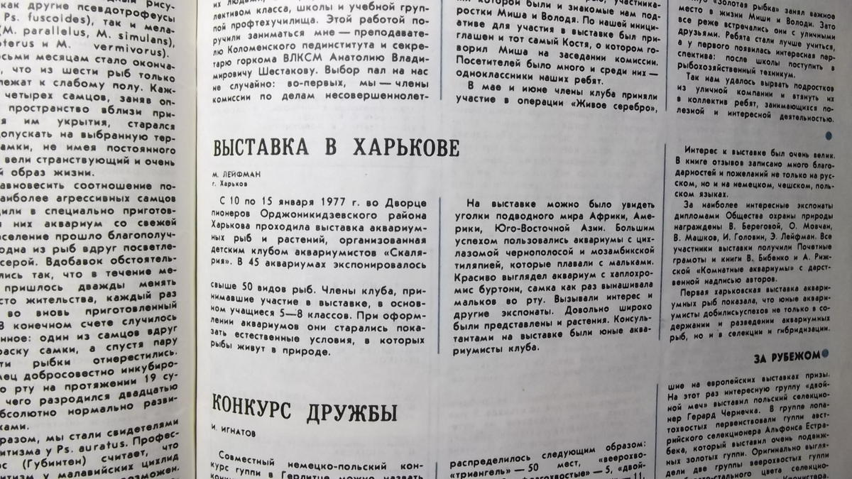У меня есть мои подшивки журналов " РиР " за несколько лет . Сильно не искал - все подшивки неделю надо пересматривать ... , вытащил наугад подшивку за1976 -77 г.г. В № 4 за 1977 год статья Николая " Из опыта разведения африканских цихлид " (см. фото 1) . О дискусах его статьи искать надо ... В этом же номере нащел заметку о выставке рыб в Харькове , представляете в далеком 1977 году ... ( см. фото 2) . . .
