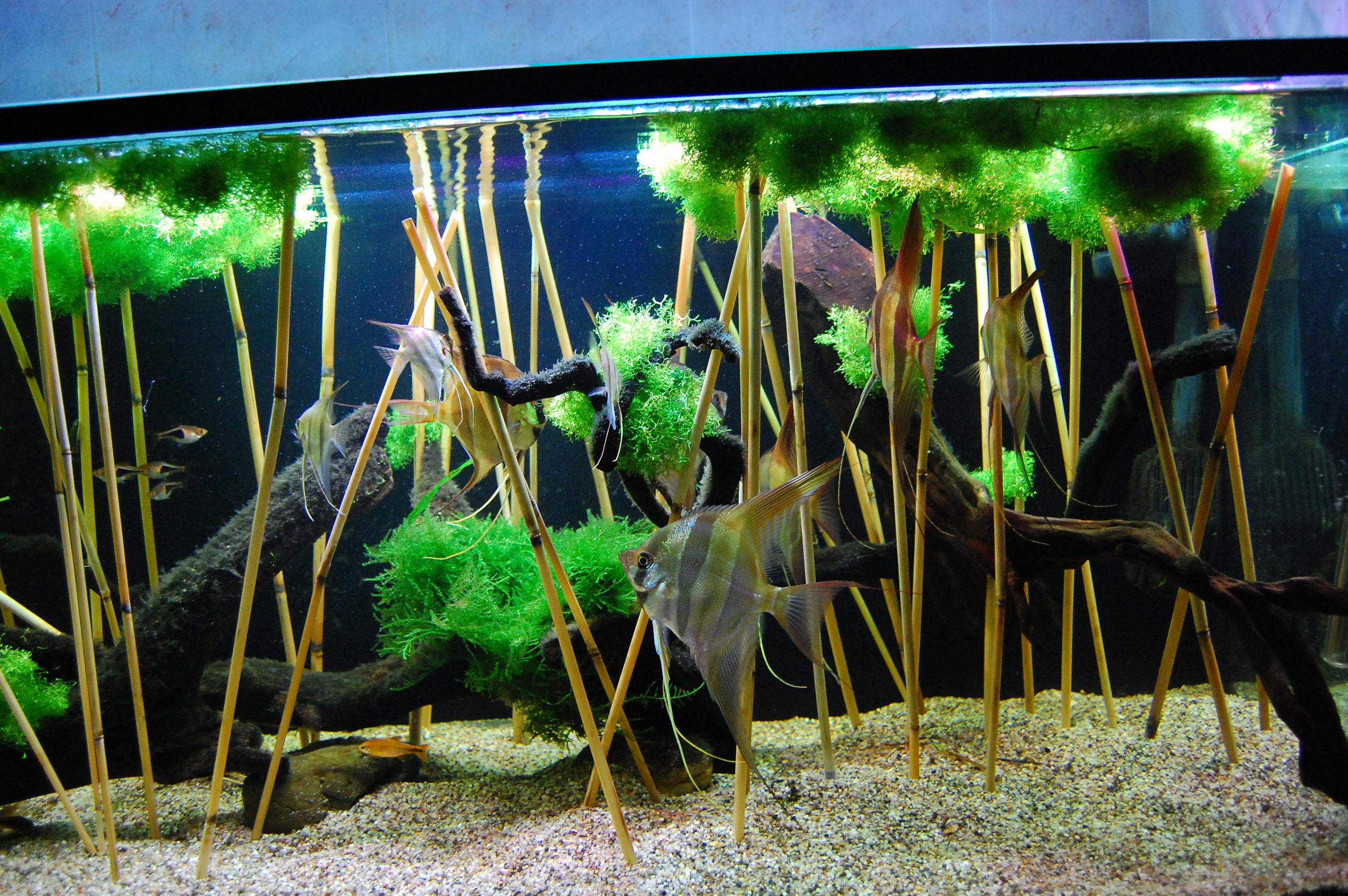 Я недавно видел подводное видео скалярок, так там у них был не камыш а нимфеи кубышки - надводные листья и длинные черешки. Было прикольно. У вас как то сильно забор получился.