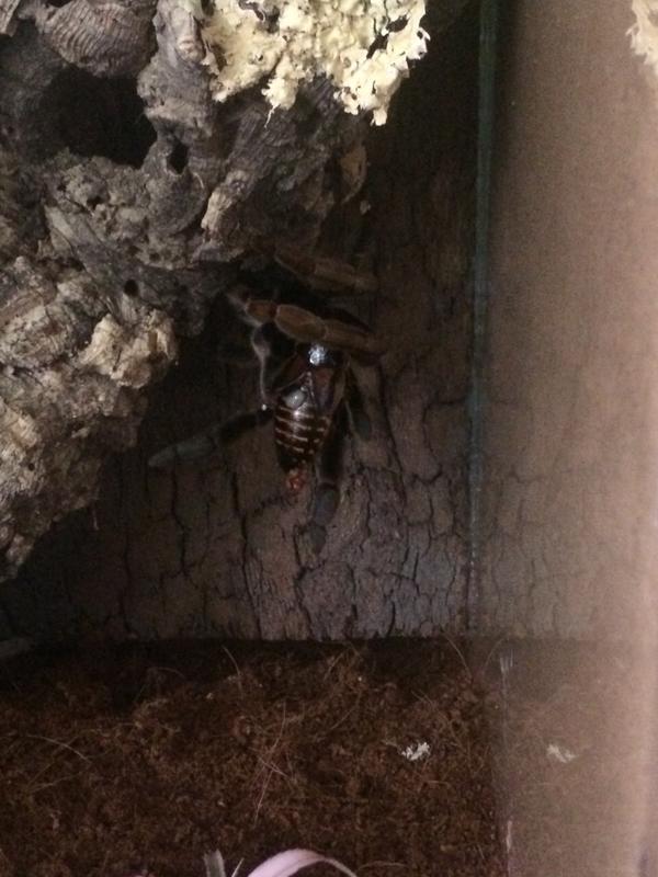 Хотелось мне после брахи активного в меру агрессивного паука, выбор пал на кебриджа) Красивая зверюга, мощные лапы, размер-мама не горюй... Но,за два с лишним месяца о том, что зверь жив говорят "потеки" на стекле, аккуратные шарики останков ко под дверью и кусочки субстрата в поилке... Паутины нет, при малейшем шорохе скрывается в дупле. Может характер поменяется после линьки?