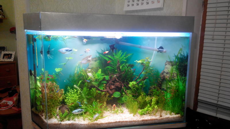 15 июня 2014 состоялся запуск новой аквы и все происходило нормально. почти все рыбы были поменяны. Остались только жемчужные гурами 2, анцики 2, неоны и было куплено 6 маленьких скалярий и с надеждой в будущем когда определиться пара оставить одну пару. Грунт при перезапуске был замене на кварц (белый фракция 3-5). Был сооружен аппарат киппа и приобретены тесты и удо ермолаева. так же в крышке разместил 4 лампы Т8 по 18ватт 59 см. Все росло и пылало до недавнего времени. Решил устроить глобаьную стрижку и редизайн. в итоге помутнела вода, походу слишком большой всплеск органики. и вот бы мне вспомнить детство и прибегнуть к старому опыту.... но.... почитав форму насоветовали мне увжаемые люди засунуть во внешник 2 таблетки Тетра бактозум. в Итоге 15 февраля на утро вместо ожидаемого просветления воды получил 80 процентов трупов рыб... вообщем так сказать слишком увлекся и перемудрил.... причин могло быть много. но уже не важно. решено было делать полный перезапуск. Благо растения было куда отправить, на подоконнике стоит барбусятник 80*25*40 с суматранцами( в этой акве не СО2 не удо никаких заморочек... и все просто иделаьно растет и вообще)))).....