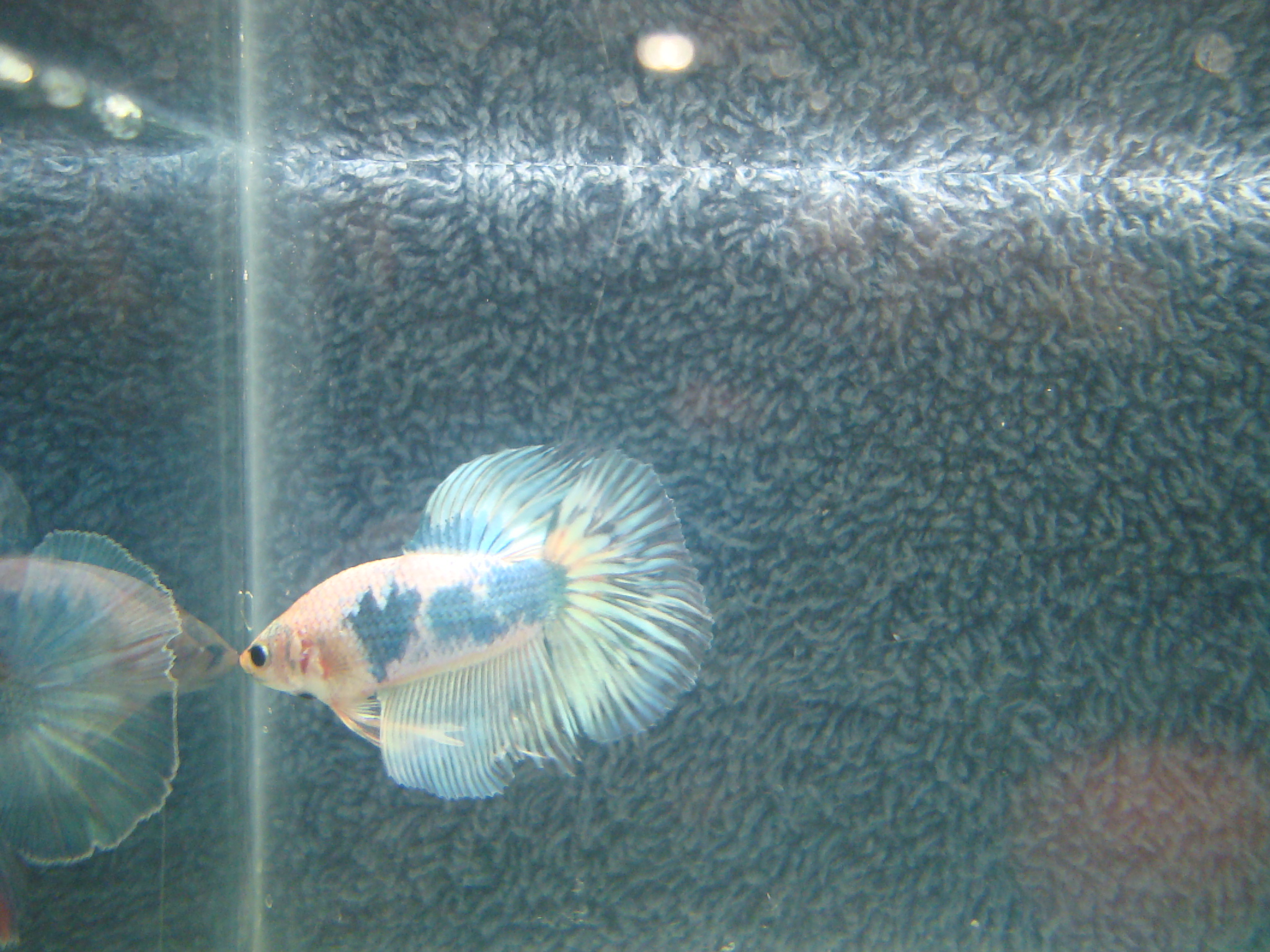 В настоящий момент имем штук 8-10 самцов. А может и больше.... Окрас Черно-бело-пятнистый с яркими оранжевыми хвостами и голубоватыми плавничками. Крааасивые... В свете холодных диодов переливаются. И несколько самок - сереньких с желтыми и рыженькими хвостиками.