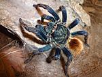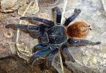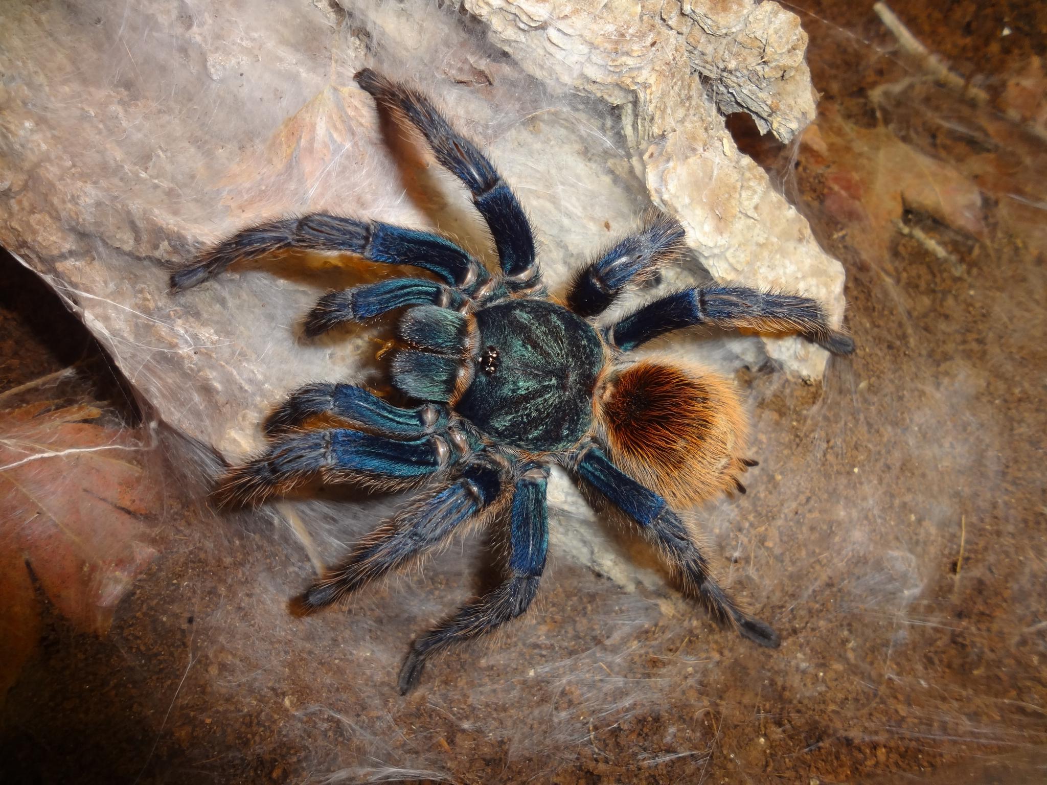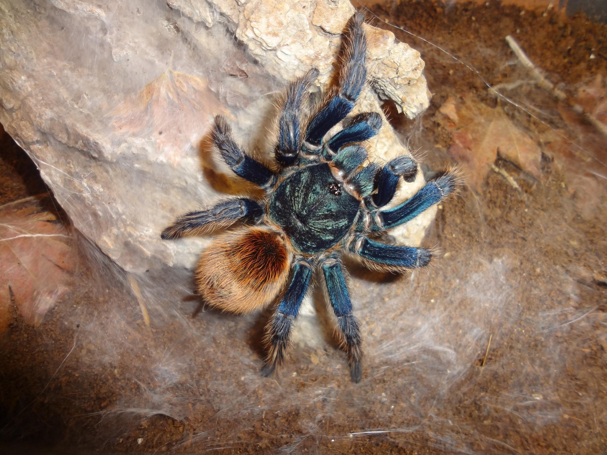 Взрослая самка Chromatopelma cyaneopubescens (Strand, 1907), содержится у меня на смеси глины и кокосового субстрата в соотношении примерно 80%+20% + укрытие из коры, которое используется крайне редко, чаще самка сидит просто на нем сверху, как на фото.