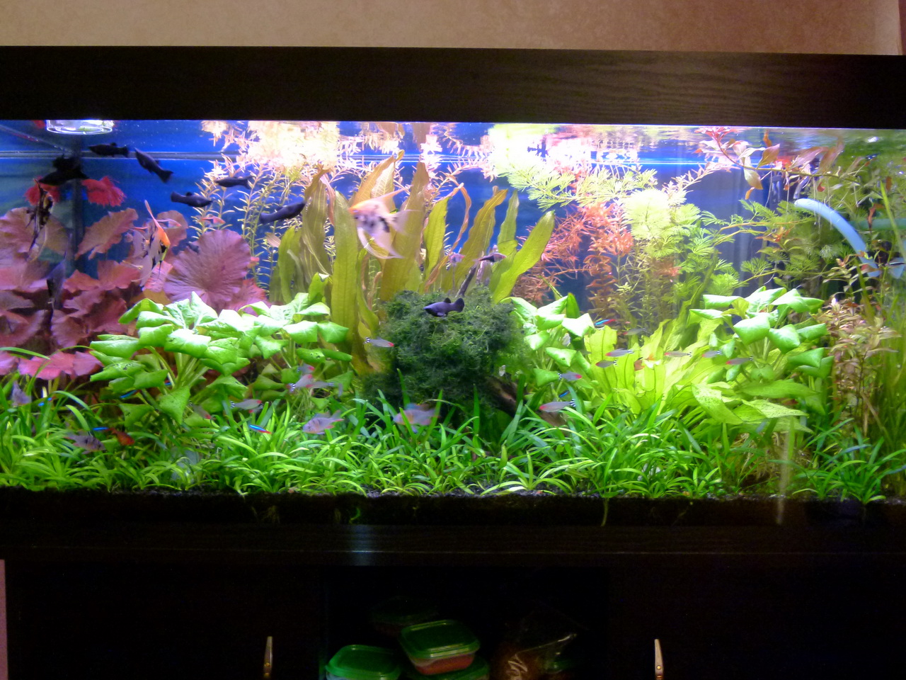Спустя 2,5 месяца выглядит вот так. Очень хочу избавиться от быстро растючки (например людвигия) но очень жалко... И ещё не получается из роталы индики выстроить композицию, очень быстро растет и стелется на поверхности, может кто подскажет секрет.