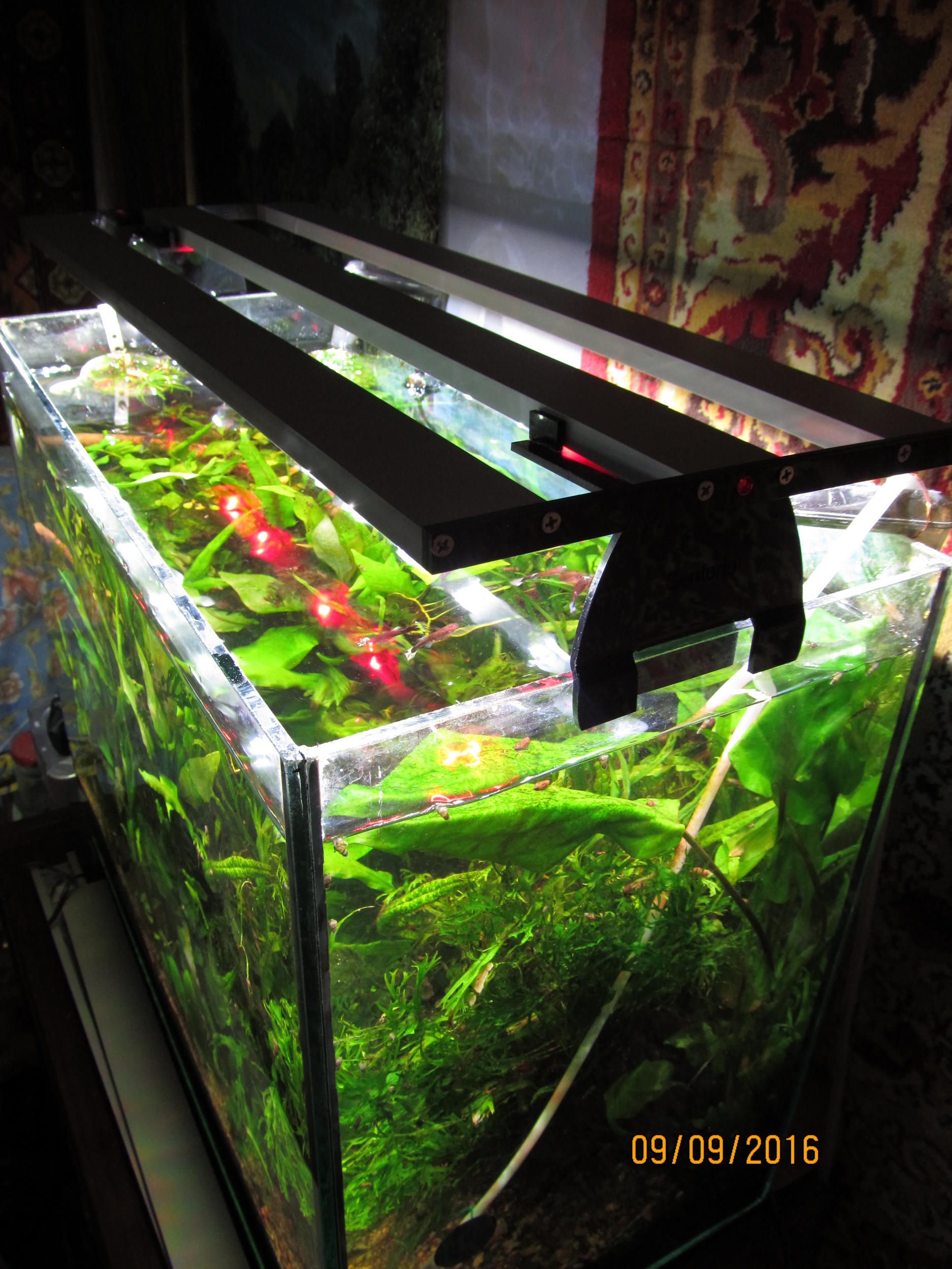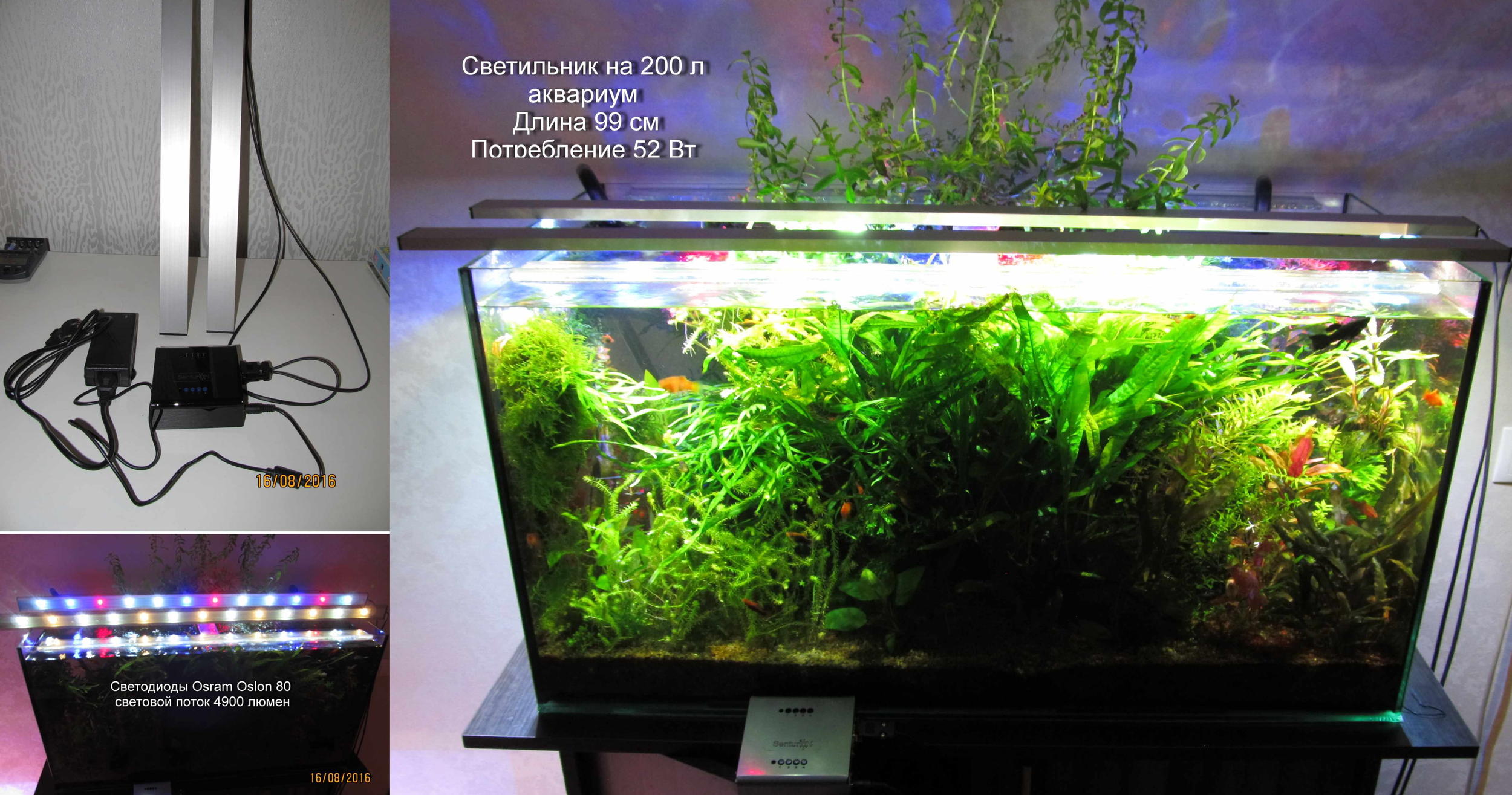Светильник эконом класса с яркостью 22 лм/л светодиоды Осрам. По цене получился в 1270 грн. Видео снимал в зоомагазине у Владимира Пономарева (Vladimir456) на конкурсном аквариуме "Природа" 140 л. Фото делал на своем травнике.