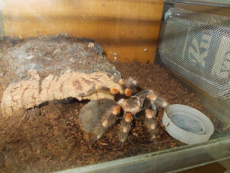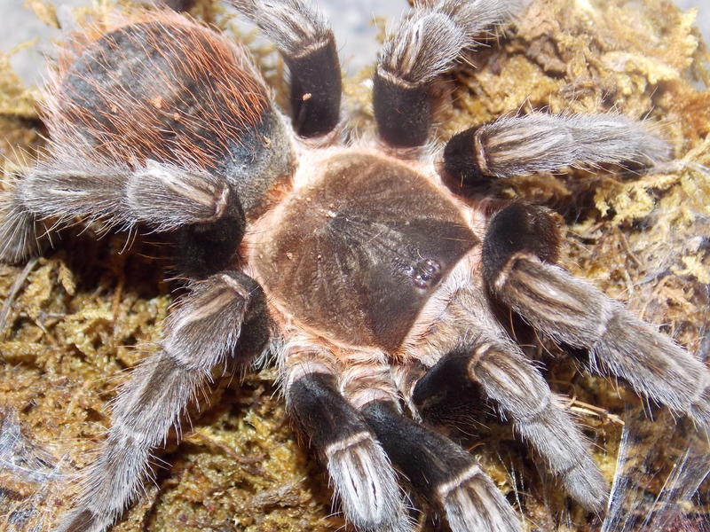 У цветных брах в основном держу влажность грунта незначительной , постоянны в увлажнении только участки (сектора ) и даже у малышей стараюсь более чем рыхлость не допускать ( пример максимума (на фото молодая самка Brachypelma auratum )):