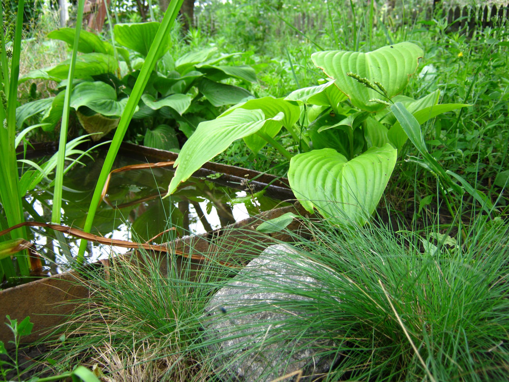 Вот месяца 2 назад заделал маленький прудик из подручных средств. Сосуд не знаю от чего но имеет приемлемую для выращивания растений форму, объем примерно 200-300 литр. Рыбы нет, так как есть кот-рыболов. Из водной растительности : Кубышка желтая, рогоз, резак алоэвидный, роголисник, амбулия и сальвиния плавающая и мшатная коряга из нано; из прибережной: дуб, келерия, два вида хост, частуха и еще какой-то злак. Все отлично растет, вода чистая, водорослей нет, хотя в первый месяц была нитка. А так мне нравиться.