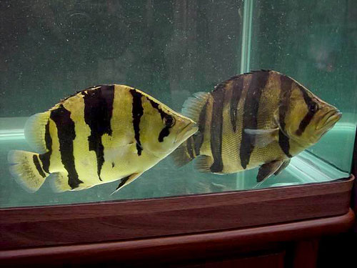 В акве тигровые окуня прекрасно сочетаются с любой крупной рыбой , агрессии не проявляют . в случае группового содержания равномерного роста не бывает .