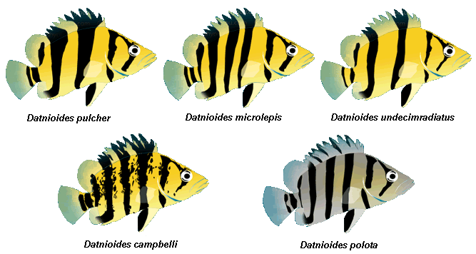 Тайские рыбоводы делят D.pulcher на 3 вариации :сиам ,тонлусап, чаупхрая , последние два названия означают места вылова . это дополнительная путаница окончательно сбивает с толку .А если учесть что D.pulcher выловленный в Камбодже D .kvaq. в прайс листах многих азиатских поставщиков окуня идут под своими обозначениями : quadrifascianus (NTT) pulcher(st) undecimradiatus+poloto ( at) microlepis (it) campbelli (ngt)