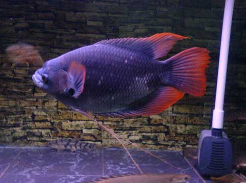 osphronemus laticlavius, гигантский краснохвостый гурами .Еще один не маленький обитатель Азии . Длинна до которой дорастает этот гурами от 40 до 50 см . Его часто путают с Osphronemus gorami но это совершенно другая рыба , разницу видно с 7-10 см laticlavius имеет розоватый оттенок не парных плавников . В остальном поведение и остальные условия схожи .