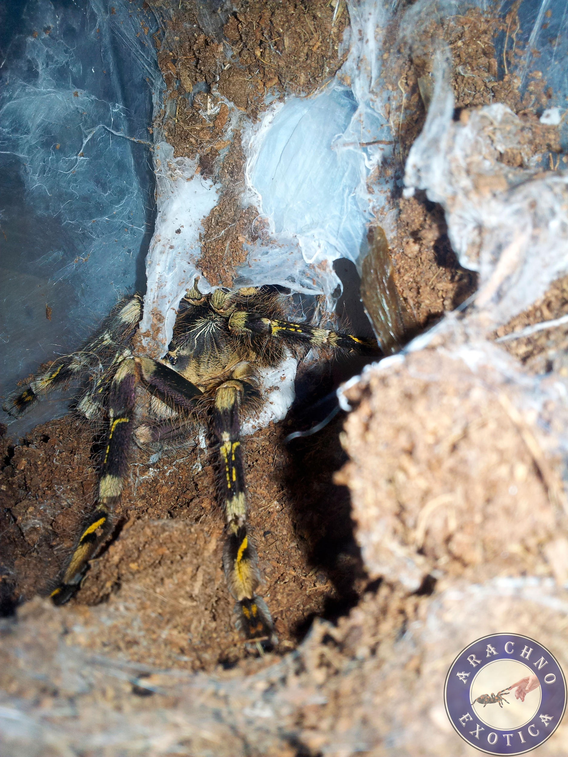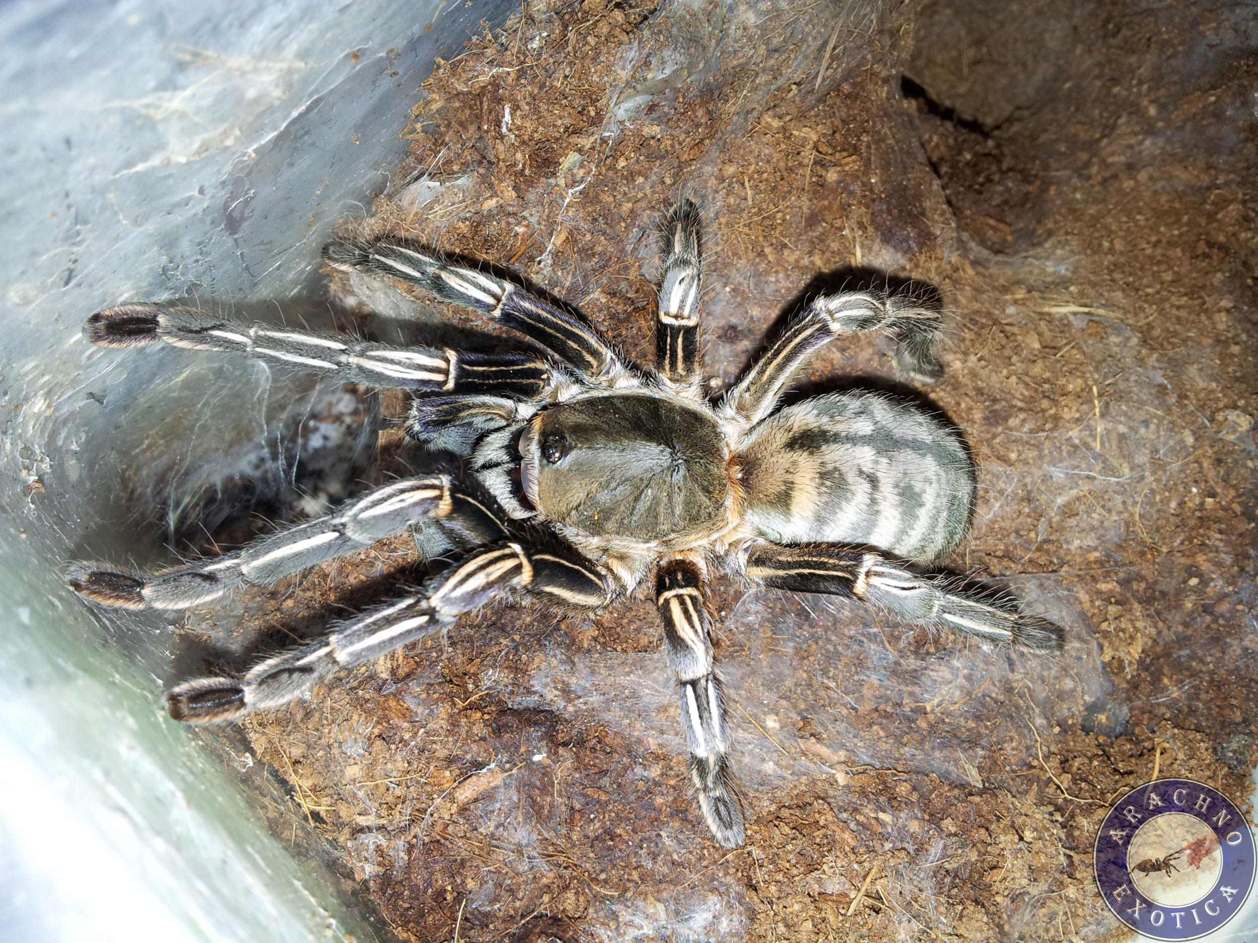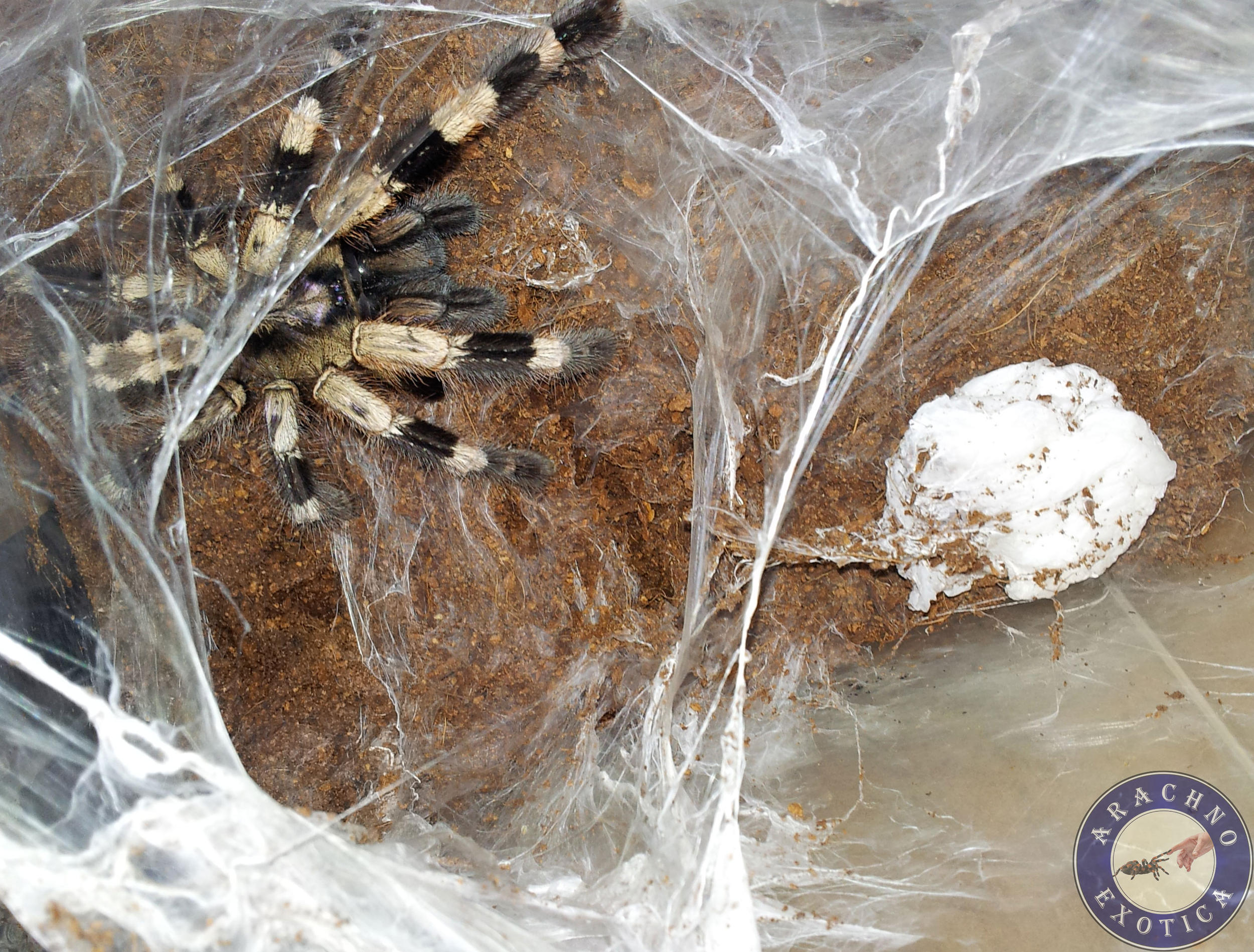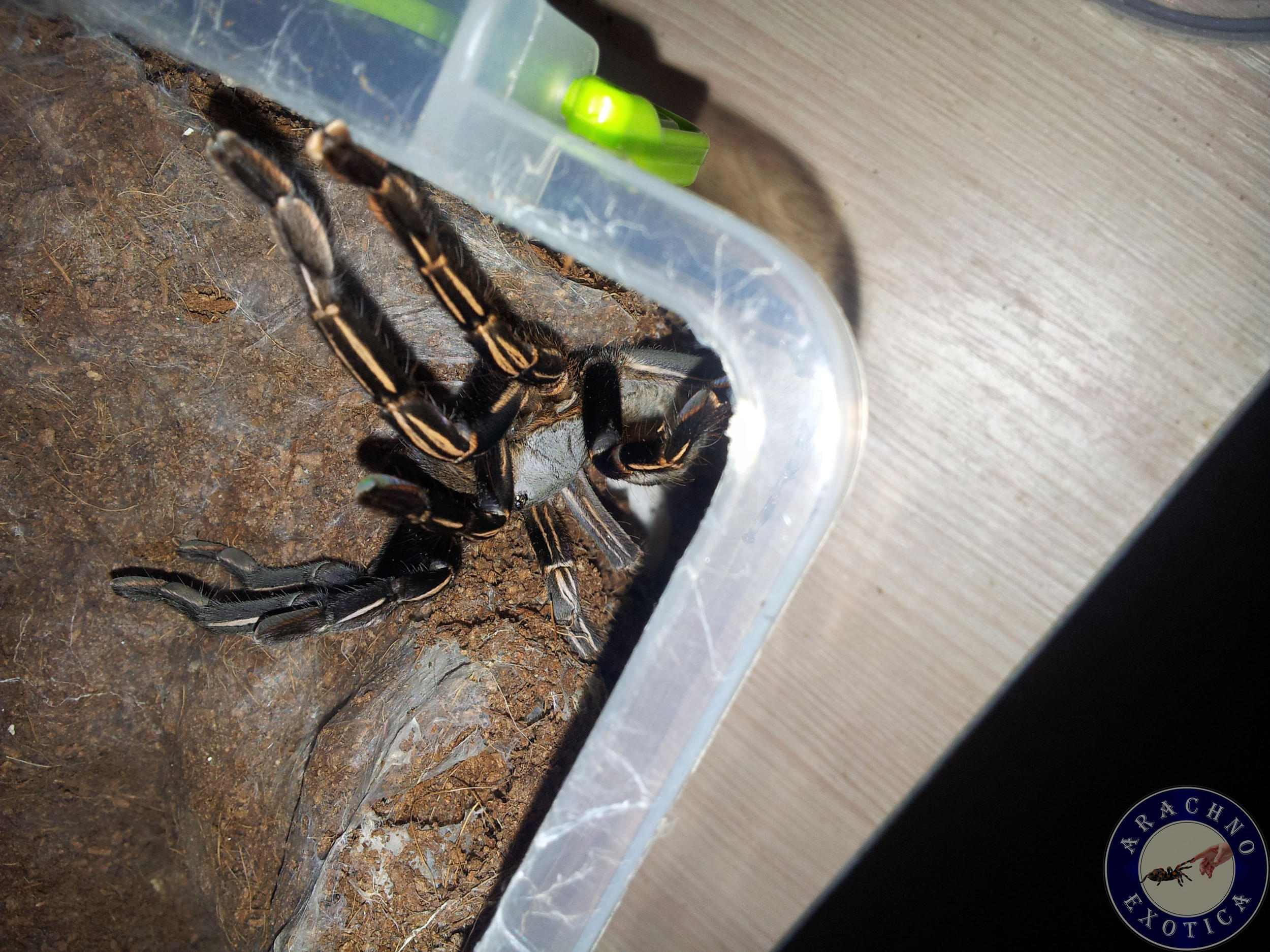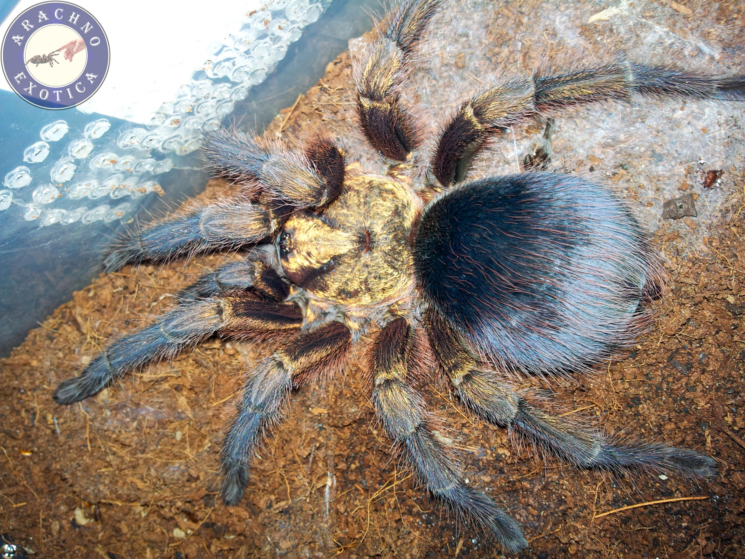 Самка крупная, около 20 см по лапам, покупалась уже взрослой, полиняла у меня разок и уже была готова к спариванию. Самцов было два, оба брались у Паши Калиты. Спарился каждый из самцов с самкой по одному разу, не без приключений, как это частенько бывает у наземников. Один из кавалеров был съеден, а второй унес лапы, но с оторванной одной педипальпой. При повторном подсаживании уцелевшего самца, самка отреагировала агрессивно, после чего парень был продан.