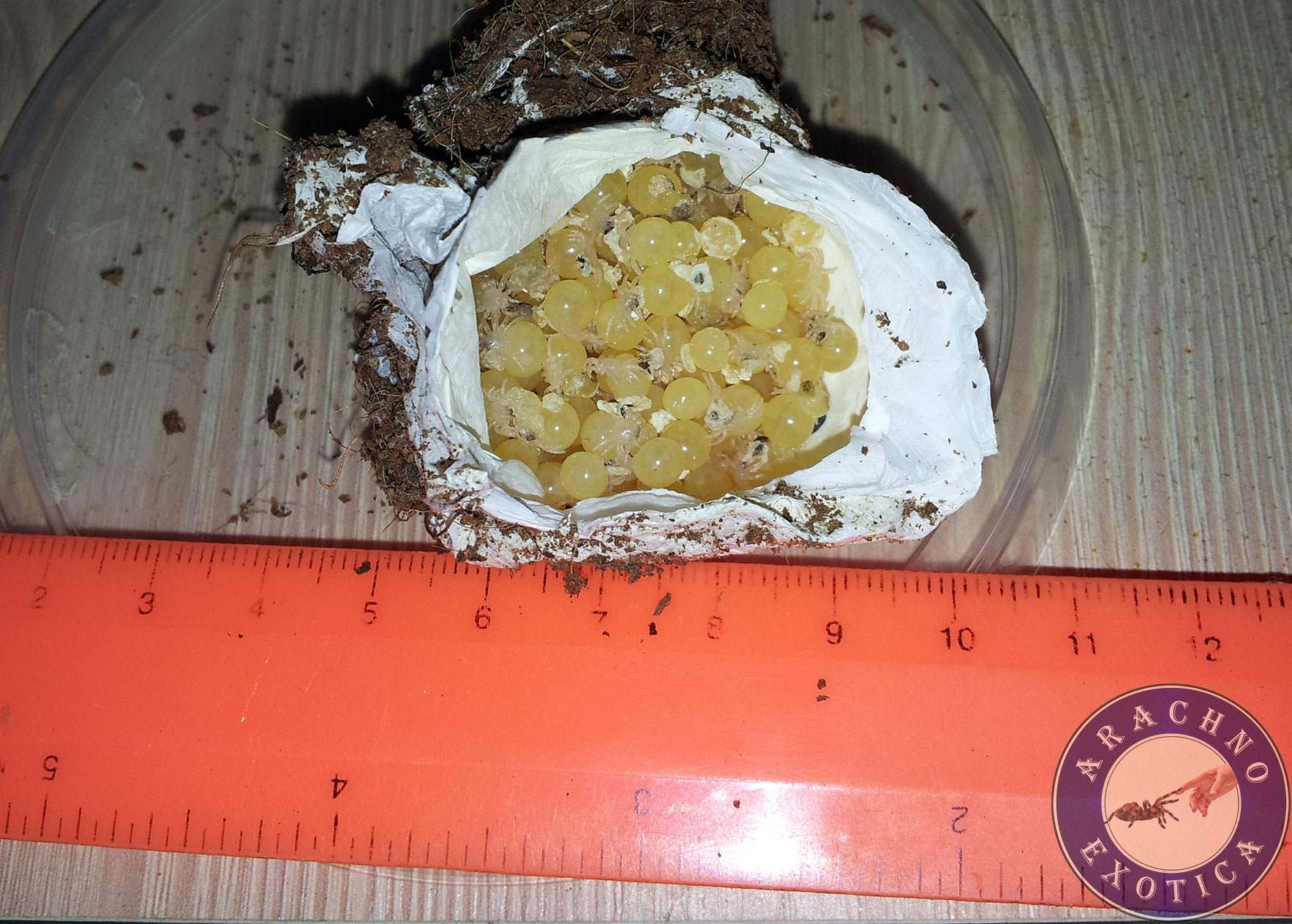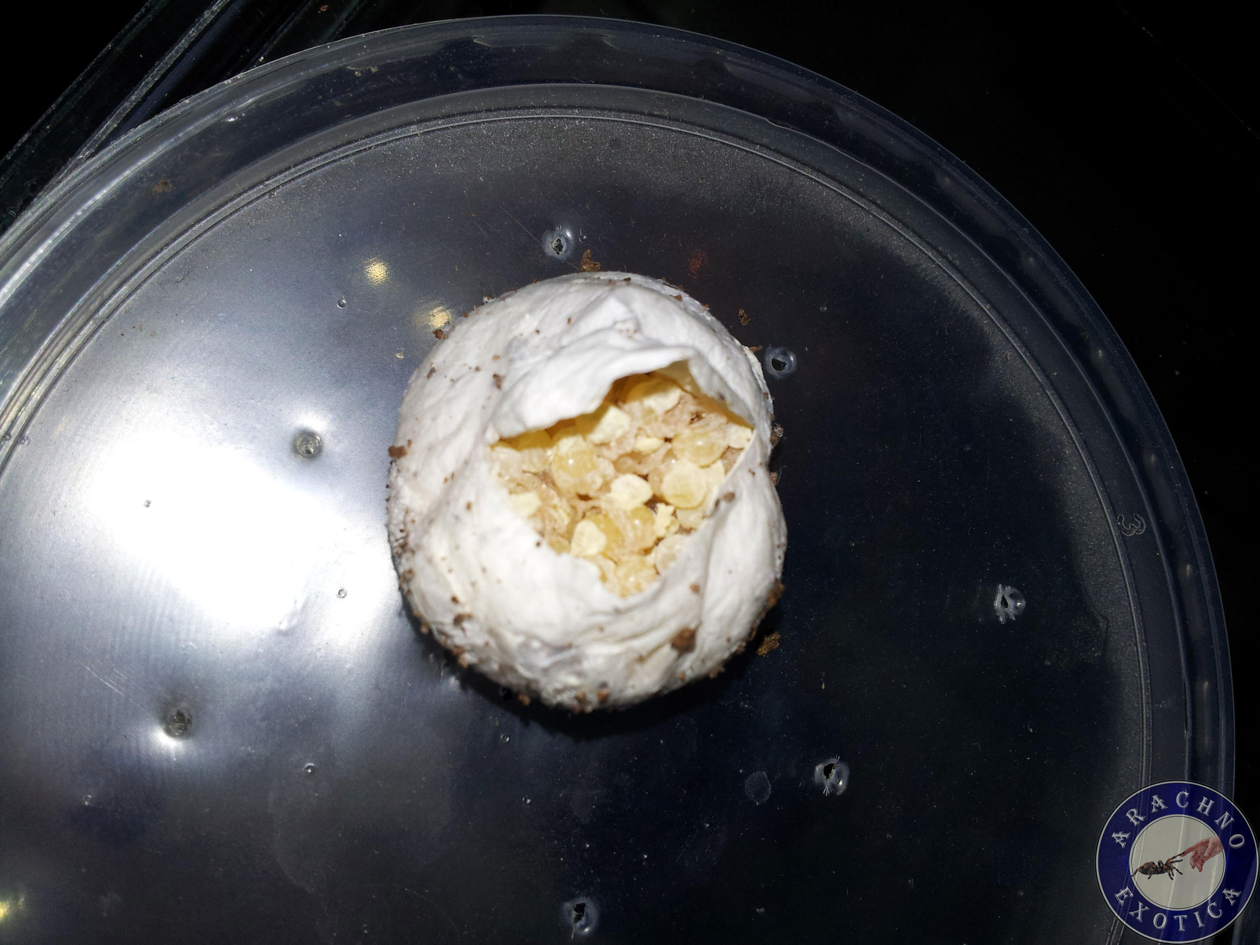 Через 2 месяца, после последнего подсаживания самца, абдомен самки заметно округлился и увеличился в размерах, питалась она при этом просто отменно. Примерно за 10 дней до плетения самого кокона началось обильное заплетание всего терра паутиной. Далее последовала кладка самого кокона, за время его вынашивания самка не кормилась. Отобрал я кокон на 22 день, без боя, просто отвлек самку тараканом. При вскрытии внутри обнаружились порченные яйца и нимфы 1 стадии, которые частично слиплись. После очистки нимф я поместил их в инкубатор. Температура в инкубаторе составляла 27-29 градусов, влажность (по показаниям китайского прибора) 90-95%. В процессе инкубирования наблюдался большой падеж нимф разных стадиях развития, в итоге в первую линьку удачно перешло всего 8 пауков.