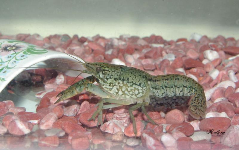 Сначала при вылуплении рачата где-то около недели сидели на маме, в это время у них не был развит хвостовой плавник. Первые дни у рачат глаза были как бы спереди. Когда после линьки развивается хвостовой плавник рачата начинают покидать маму. Пришлось по очереди постепенно всех выловить.