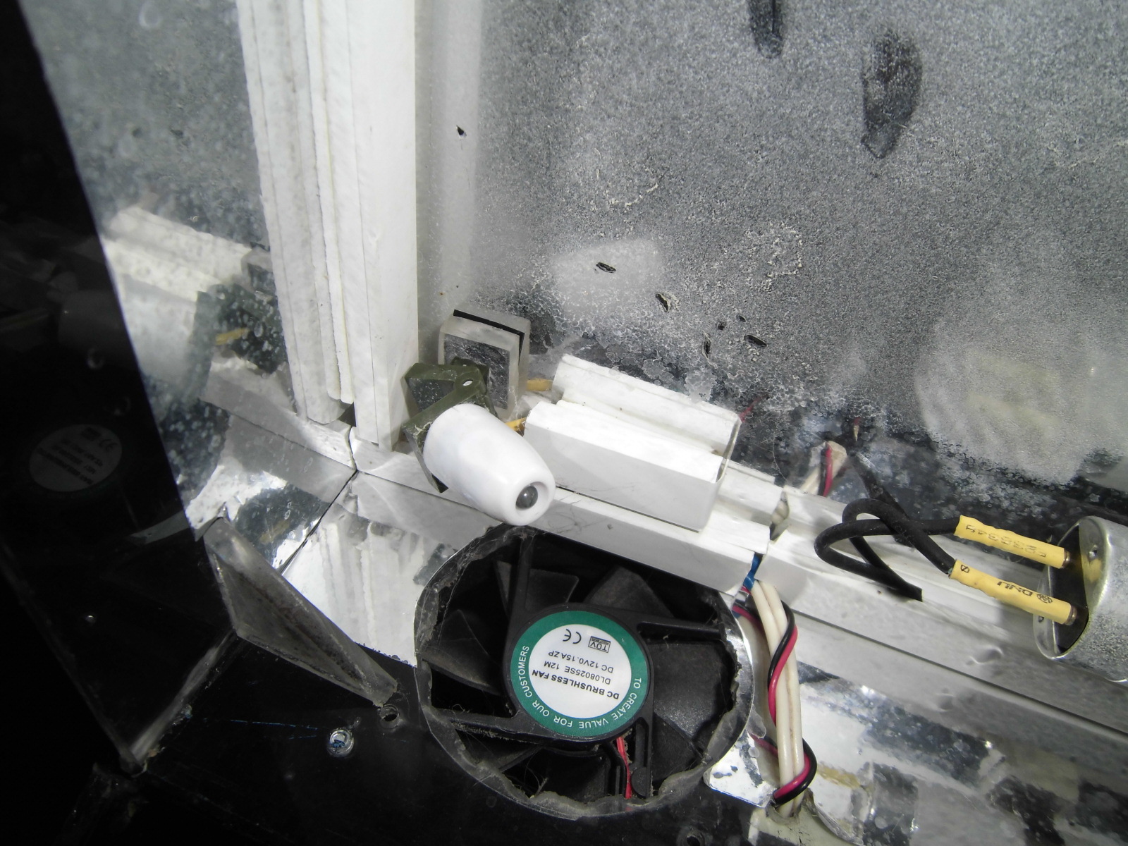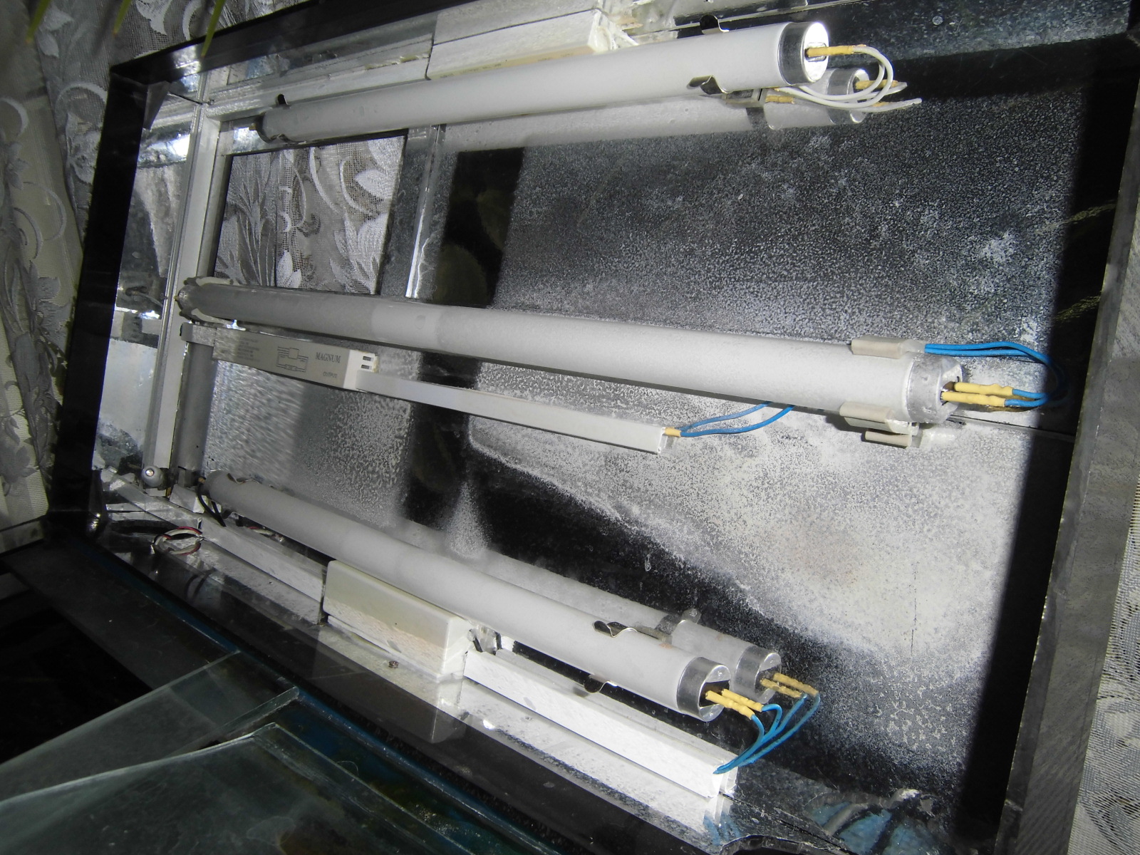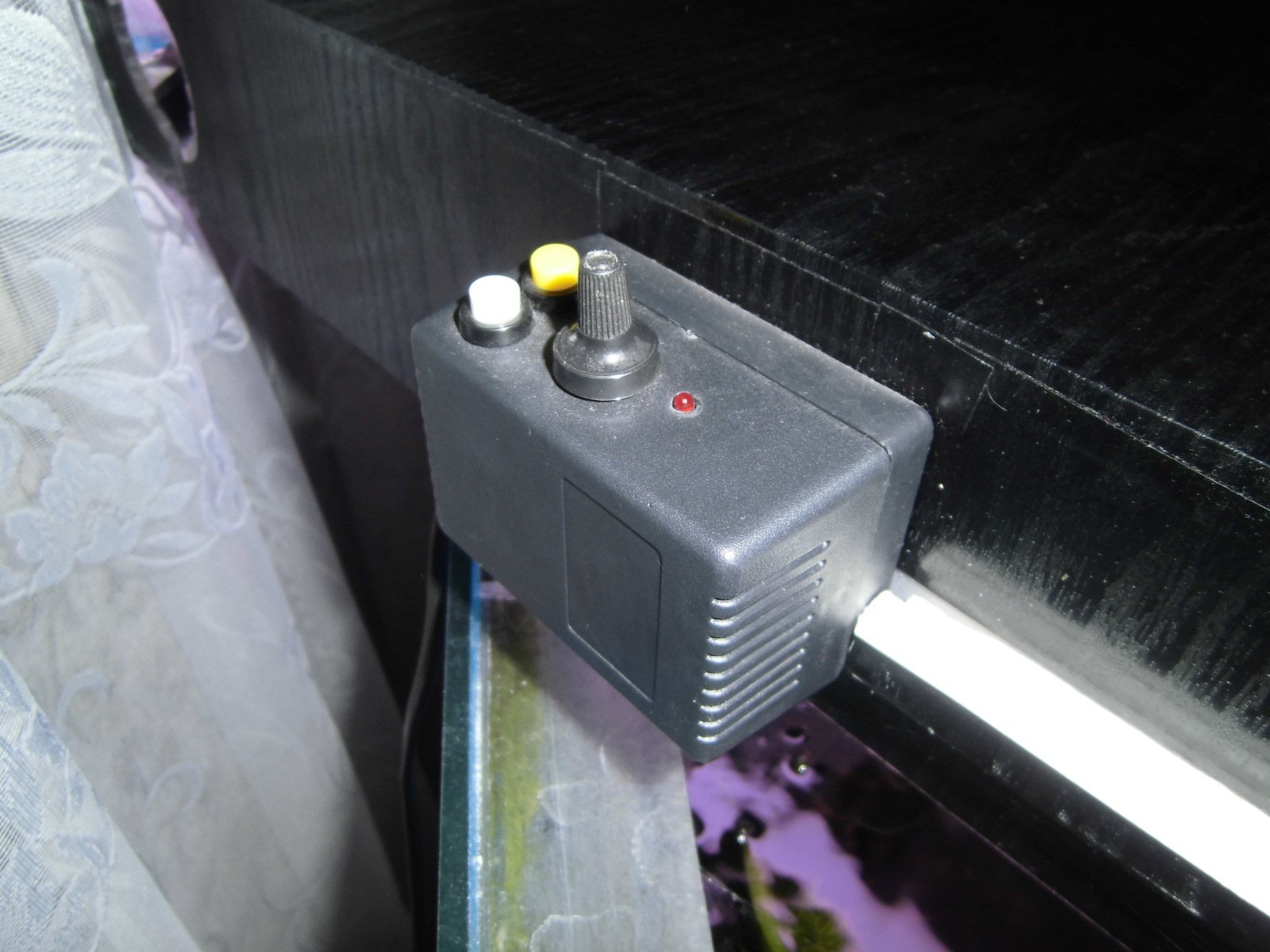 Эти моя вторая крышка, первая вообще из пенопласта была. Так вот сделал я её из оргстекла, так ка этот материал был у меня в наличии и податливый при работе с ним! С клеем определялся долго, везде написано, что клеить только дихлорэтаном, так вот нашёл клей (недавно вышел) "Момент гель универсальный" специально для оргстекла и ПВХ в том числе, схватывает на мертво и не дорогой!!! Изнутри крышку обклеил зеркальной клейкой плёнкой (продаётся везде где обои). Снаружи такой же плёнкой, только под чёрное дерево! На крышку окошка оргстекла не хватило, поэтому приспособил обычное стекло! Освещение прикрепил 3 лампы (2х14v, 1х18v, 1аквастар, 2гролюкс), сзади поставил компьютерный куллер на обдув (так как без него появляется конденсат на крышке), и смастерил блок управления:
