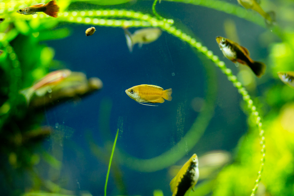 Вот моя любимица, самка макропод, совсем не яркая, не красивая, но все-же любимица, как только проходит уборка в аквариуме, постоянно подплывает к руке, пощипывает, ее свободно можна взять в руку помазать, она так у нас называется - "Мазунка"