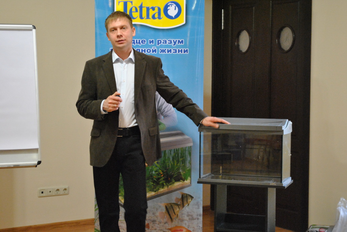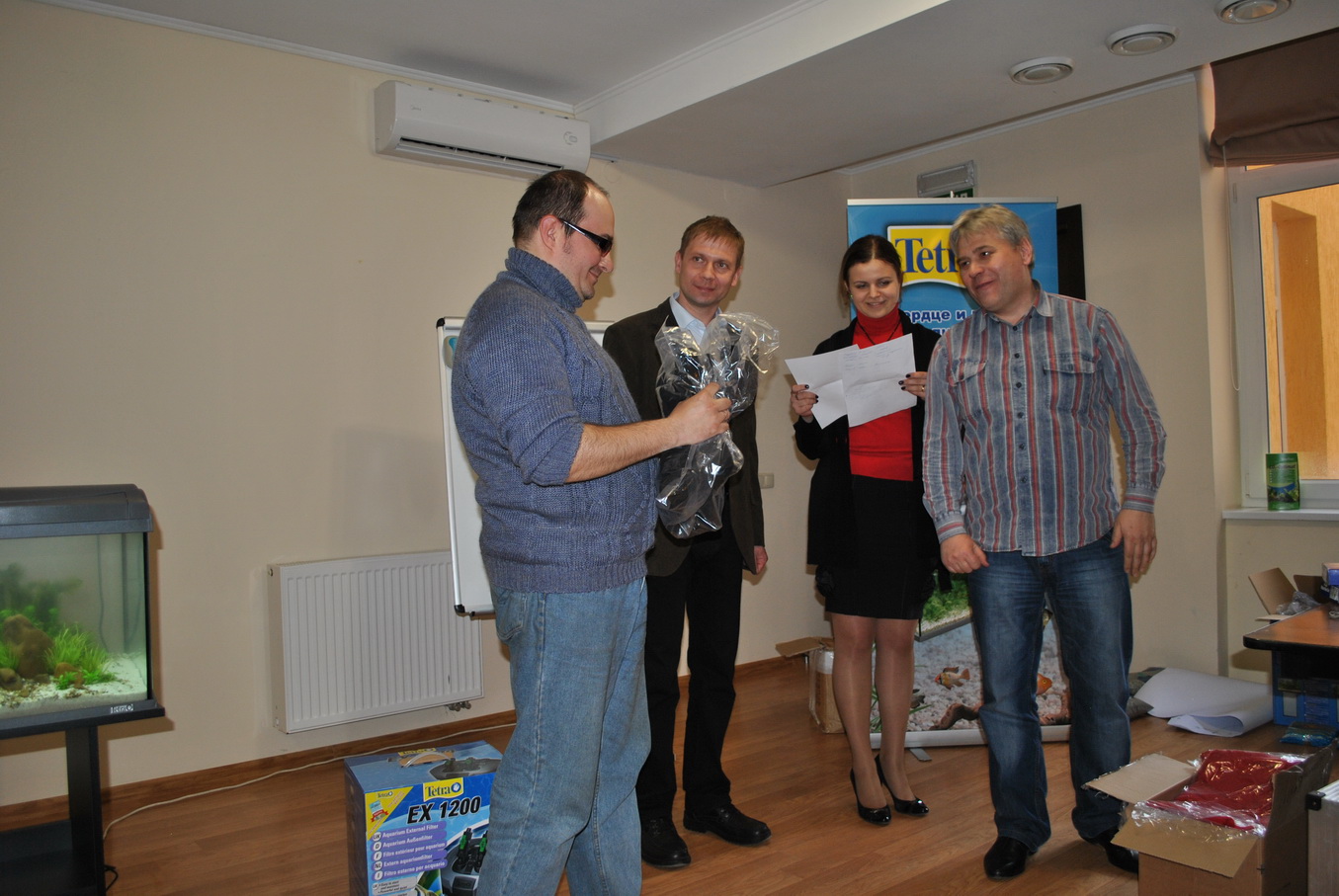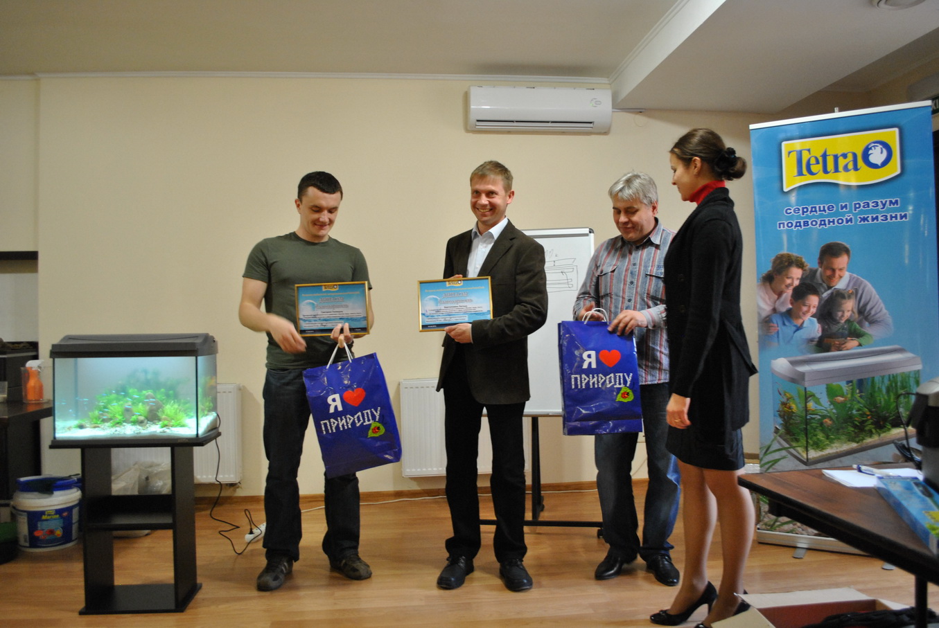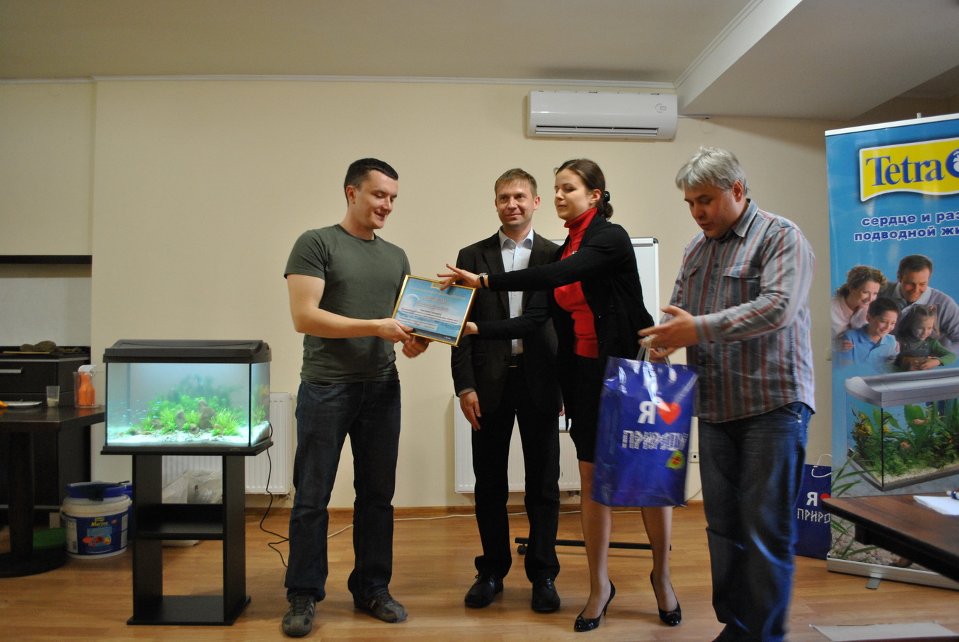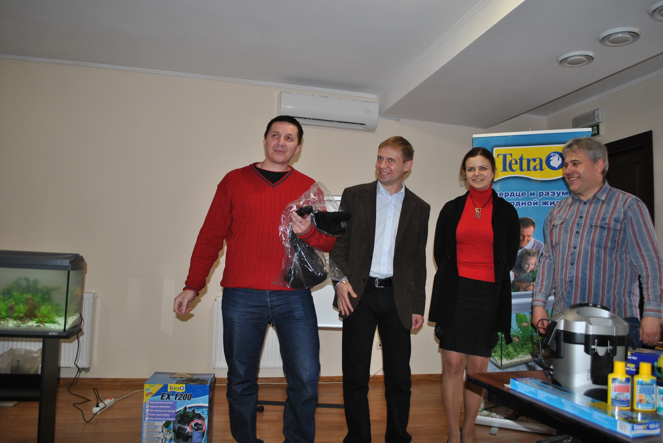 Вот этот человек – истинный любитель аквариумистики. Он приехал на заседание клуба в свой День рождения. За что и «схлопотал» подарком от ТМ Тетра