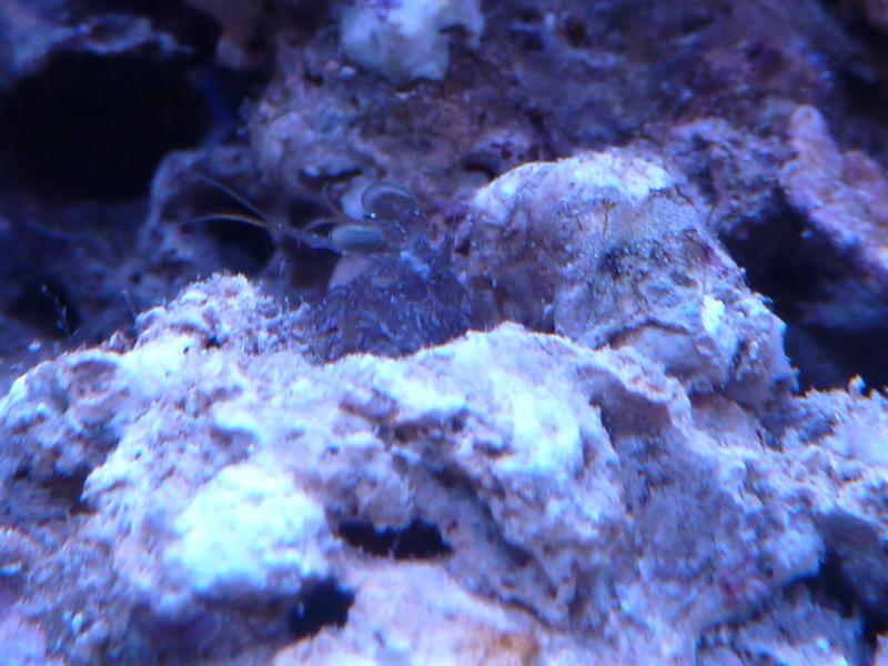 Не обошлось без жертв- Грамма Лоретто расправилась с хризиптерой- все таки боевая рыбка! Обнаружился нелегал - судя по всему рак-богомол, правда окрас серый, не яркий как обычно у этих тварей.