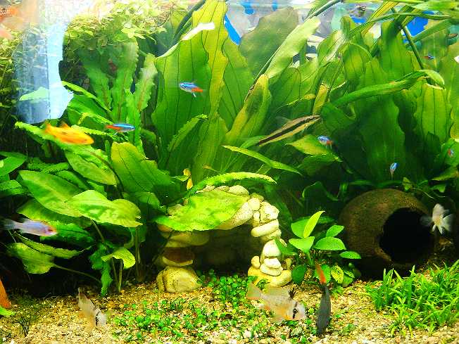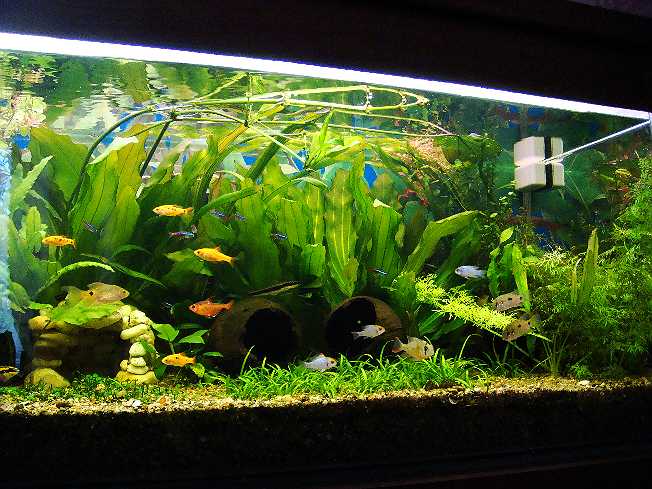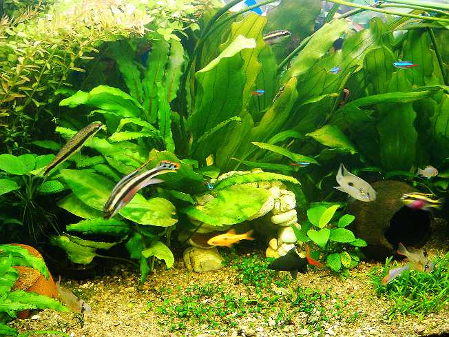 Всем доброго времени суток!!!темка на месяц заглохла и снова попытаюсь отчитаться о состоянии банки....полезла борода,с которой боролся по совету Карачи ежедневной подменой 25 литров воды и добавил в фильтр Акваэль Фосмакс бейсик-вроде как прошла,зараза.не был дома 10 дней на праздники,рыбу кормили за это время 1 раз-слава Богу потерь нет....эхи выгнали стрелки,в общем вроде все нормально...и маленький фотоотчет прилагается...