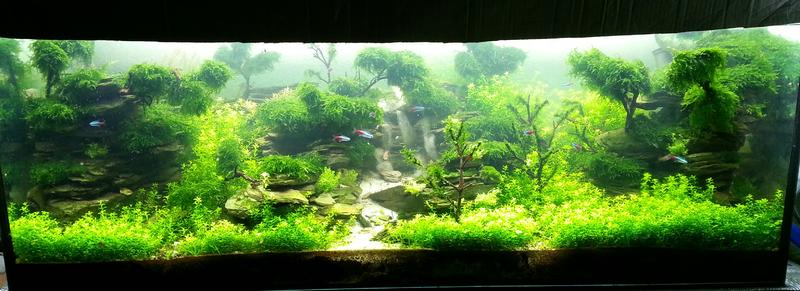 Пока аквариум растет я эксперементирую.Сделал 3 водопада, которые впадают в речку.Деревья поперемещал некоторые.Индика была до верха, но подстриг ее для нового скейпа.