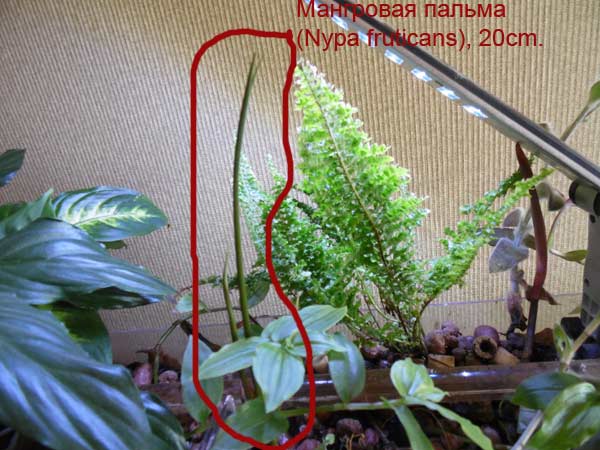 Мангровая пальма растет потихоньку. Высота сейчас более 20см, а приехала три месяца назад в размере 8см. Раз растет, то значит и выполняет свою основную функцию в фитофильтре - чистит воду от нитратов.