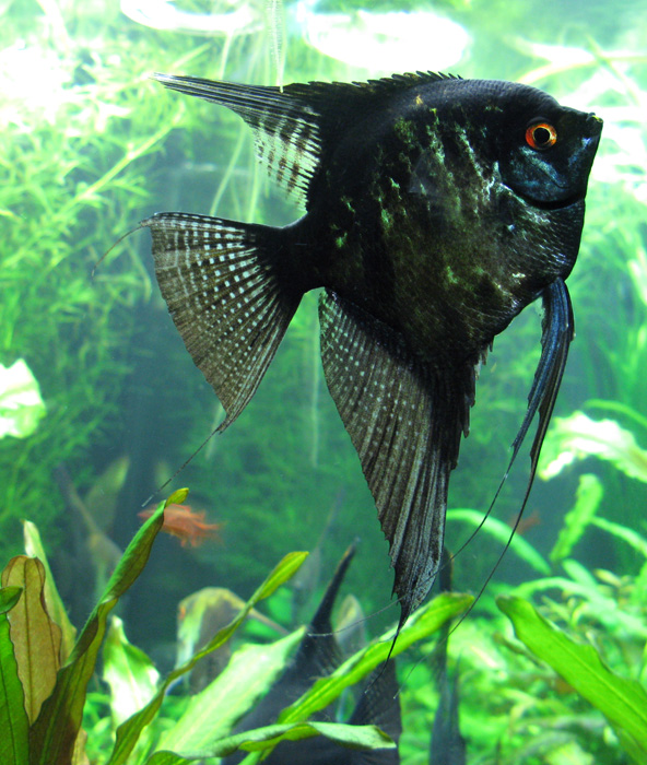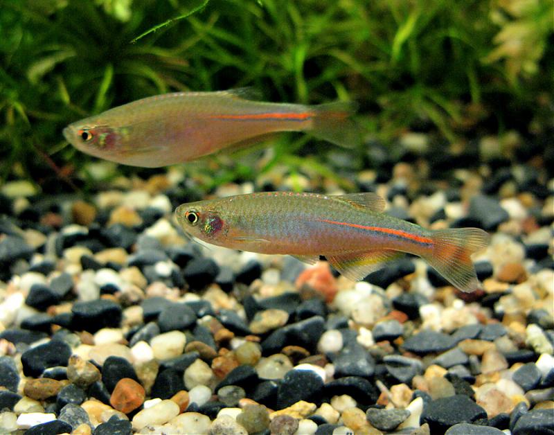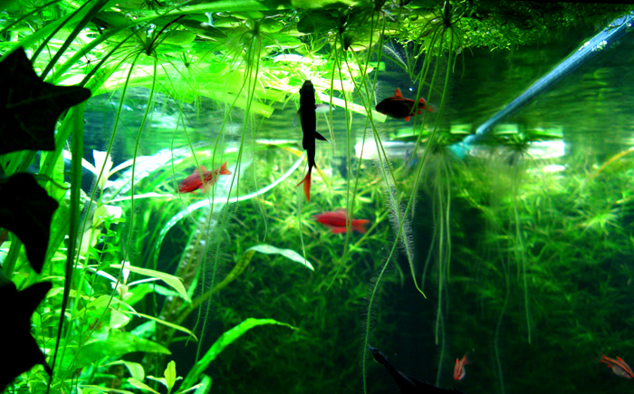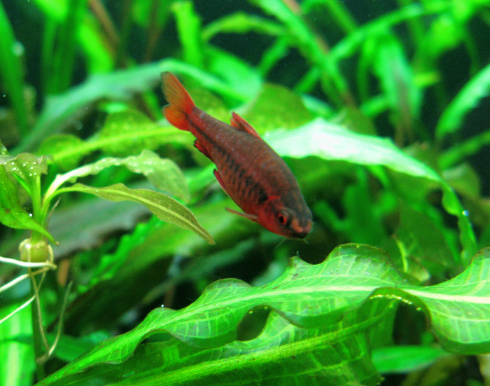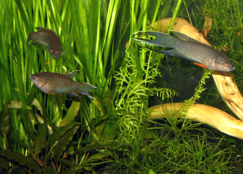 Фотик не искажает, нет. Это лампа, я про нее в первом посте говорила. Ее специально поставила для черных макроподов - эффект налицо! При дневном свете и в спокойном состоянии они грязновато-серо-коричневого цвета. При возбуждении становятся черно-коричневыми и отливают синевой. Акву я специально для них купила, а то теснились в 30 литрах в куче травы, правда плодились по-черному, теперь просто плавают, простору не нарадуются. Пацаны только обиженные по углам нычкуются - нет места пока гнезда строить. Ну и под шумок кардиналов рискнула пустить до их заселения, пока ничего - ноль внимания, а то мочили всех (именно самки), когда к ним подсаживала рыбеху.