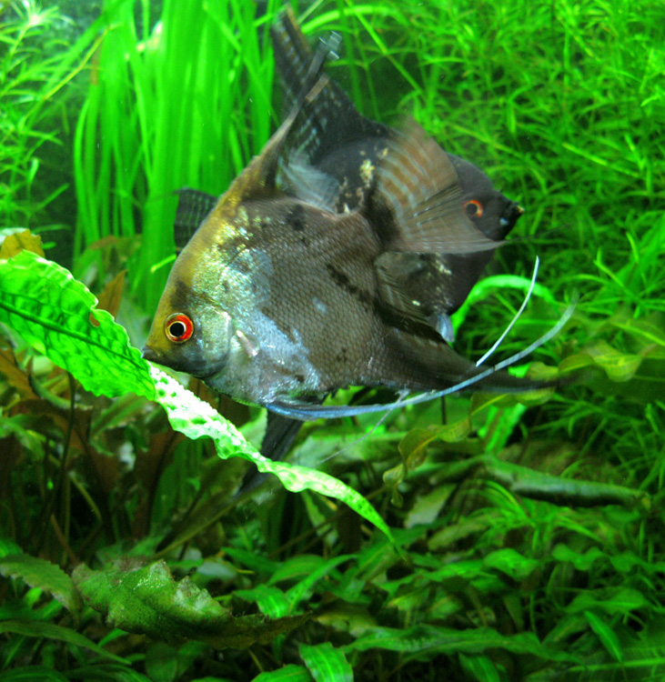 Вот фото моих любимцев. Самка что-то шепчет над икрой, а самец вышел на тропу войны. Вчера отнерестились на очень длинном листе новокупленной криптокорины, как они его поймали и согнули до середины аквариума - остается догадываться.