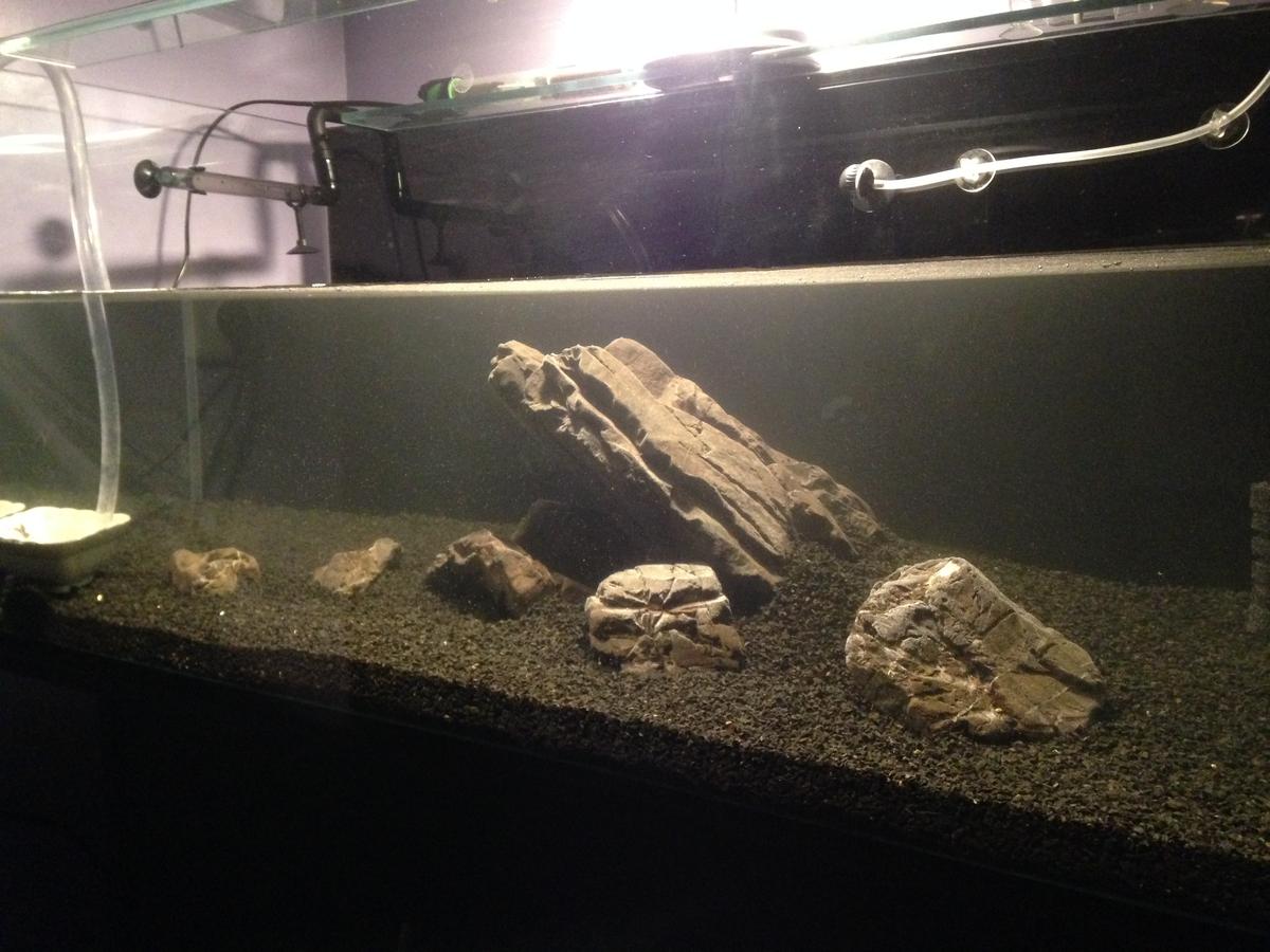 Итак, нужен совет по поводу расстановки камней и коряг. Вот фронтальное фото и вид сверху. Расстановка предварительная, еще буду сверху засыпать мелкий грунт