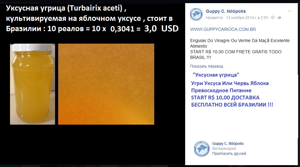 В этом посту цены в Бразилии(для "образного" сравнения с нашими) , на заморозку и корма для выкармливания родившихся мальков . По заморозке мотыля и мяса артемии , субъективно могу сказать , что за последнее время цены интернет магазинов в Харькове быстро приближаются к Бразильским ... Стоимость зимой 1 кг была от 100 грн . Харьковчан-аквариумистов спасают коллективные заказы по оптовым ценам . Но нужно учитывать , что упаковывая свой товар в термобоксы , в Бразилии рассылка заморозки идет аквариумистам в любую бразильскую деревню где есть почта . Я и некоторые мои знакомые , для борьбы с большой разницей в закупке заморозки по "летним и зимним" ценам купили себе морозильники . Например , прошлым летом в коллективных заказах из Николаева артемия была по30 гр/кг , а уже через полгода в яеваре 2016 она на опте была от 70 гр/кг . Разница существенная - 40 гр , на 100 кг это - 4000 гр , почти за сезон отбивается покупка Белорусского "Атланта"(на шесть ящиков) . . . . Также начинающие любители , я их называю "пожарниками" - первые пометы у них рождаются "случайно и неожиданно" , имеют возможность заказать стартовые живые корма с доставкой чуть ли не домой ... Нематод(Anguillula silusiae) на овсяном толокне я разводил очень давно - чисто субъективно считаю , что кормить ими малька , все равно что древесными опилками(мое ИМХО) , хотя для одного раза кормления , пока выклюнутся науплии артемии , или наловиш пыли на гребном канале - вполне достаточно . . . Говорят , что уксусная угрица более питательна и еще один плюс в аквариуме с мальками живет сутки и более , но о ней сказать ничего не могу не пользовался . Уксусная угрица (Turbairix aceti) и обычная нематода, культивируемая на овсяном толокне (Anguillula silusiae) это совершенно разные черви. Здесь способ ее культивировать - http://aquaria2.ru/node/2170 . . Еще есть Гриндальский червь (Enchytraeus buchhoizi) , аквариумистам известен как «гриндаль» — тонкий червь, длиной до 10 миллиметров . Недавно встечал объявление о желании преобрести его культуру . .