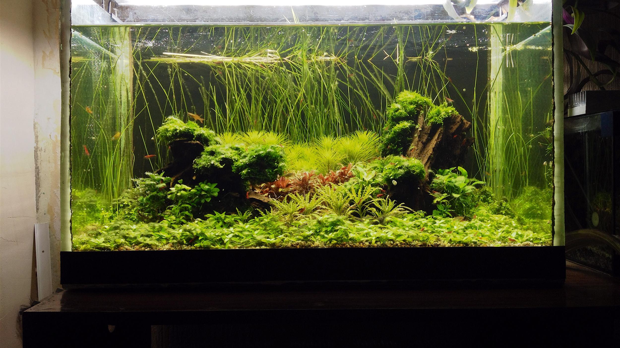 Потом аквариум переехал ,перезаряд ,растения немного поменялись ,более медленные виды ,получал вечный перекос как раз из за "пересвета",водоросли привет,но как только уменьшил на 2- потом на 3ч все стало налаживаться .Эхинодорус вырос как 30л тазик ,все точка и опять коса в руках .
