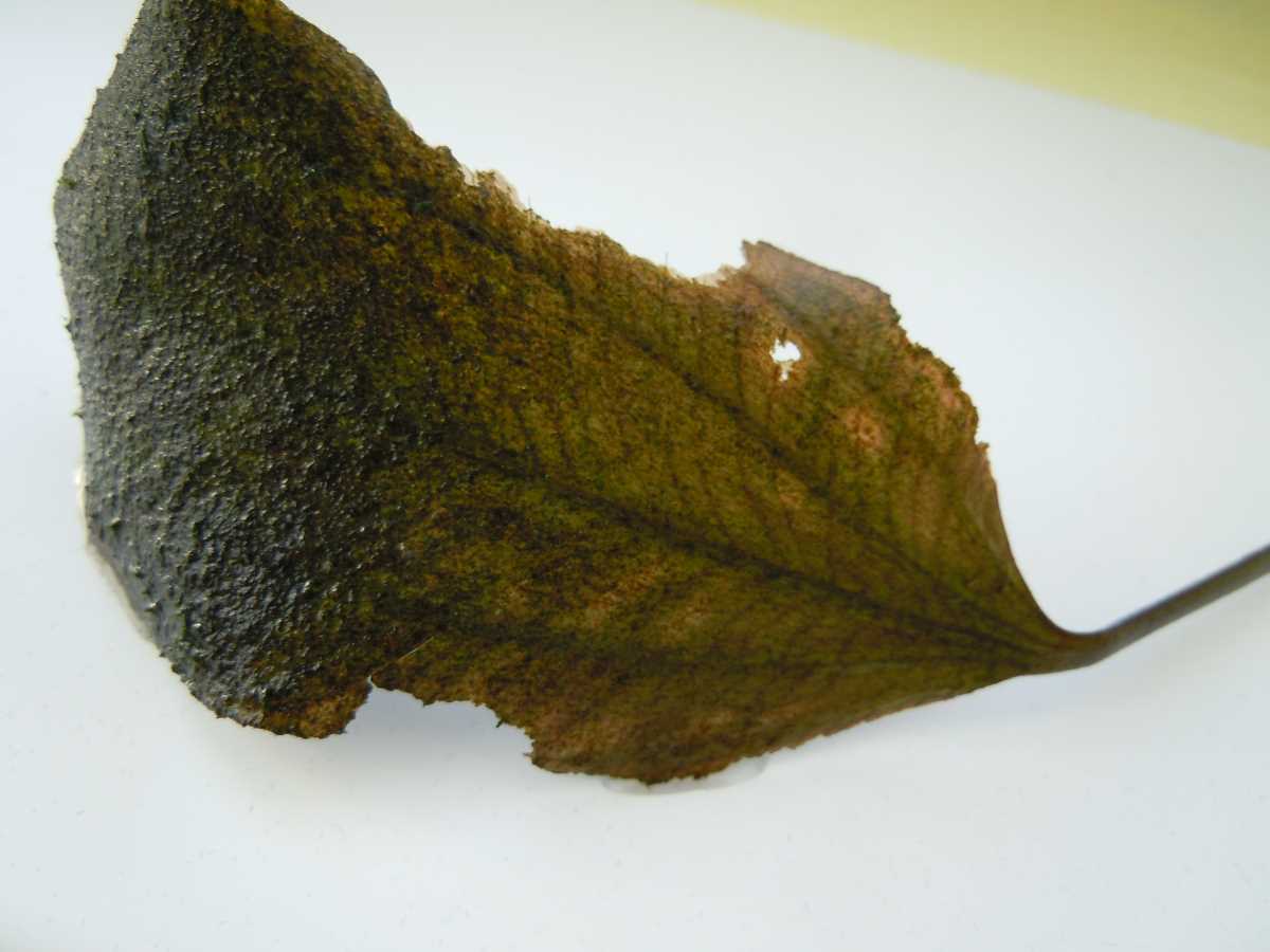 Вот старый пре-старый лист красного эха. Который я срезал только что чтобы показать чем обрастают со временем некоторые растения типа эхов и анубов.
