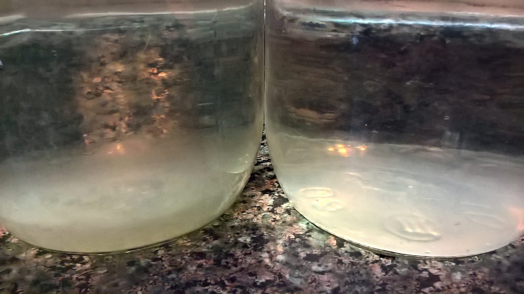 Под занавес решил проверить, что у нас делается с растворенной органикой. Из доступных средств оценки у меня есть только коагулянт. Поэтому, оцениваем "на глазок", по помутнению.