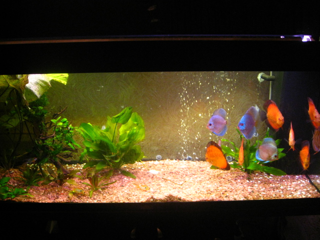Рыбы классные, корень и растения тоже, а вот фон..., соглашусь с Йода, немного портит картину. Если финансы не позволяют поменять фон на другой объемный, то мне кажется, что простой (не объемный) однотонный снаружи (чтоб не перезапускать аквас) исправил бы ситуацию и аквариум бы смотрелся лучше. Но это лично мое мнение, аквариум Ваш - любоваться Вам.  Удачи!