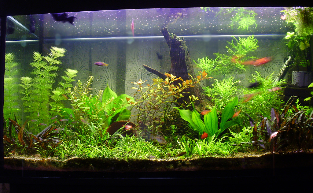 Прошел месяц после запуска аквариума. Были посажены новые растения, добавлена рыба, меченосцев теперь 10шт, Черных Молли 6шт, Сеамских водорослиеда 2шт, Апистограмма Рамирези 4шт, Апистограмма Борели 4шт, Сом Таракатум 1шт, Неокоридины (штук 10 приблиз), забыл сказать, аквариум запускался по системе из фильма Тетра, с субстратом , Нитрат минус шариками и всякими добавками к воде. Борели выводят мальков , сейчас штук 20 плавает возле грунта под корягой под присмотром родителя