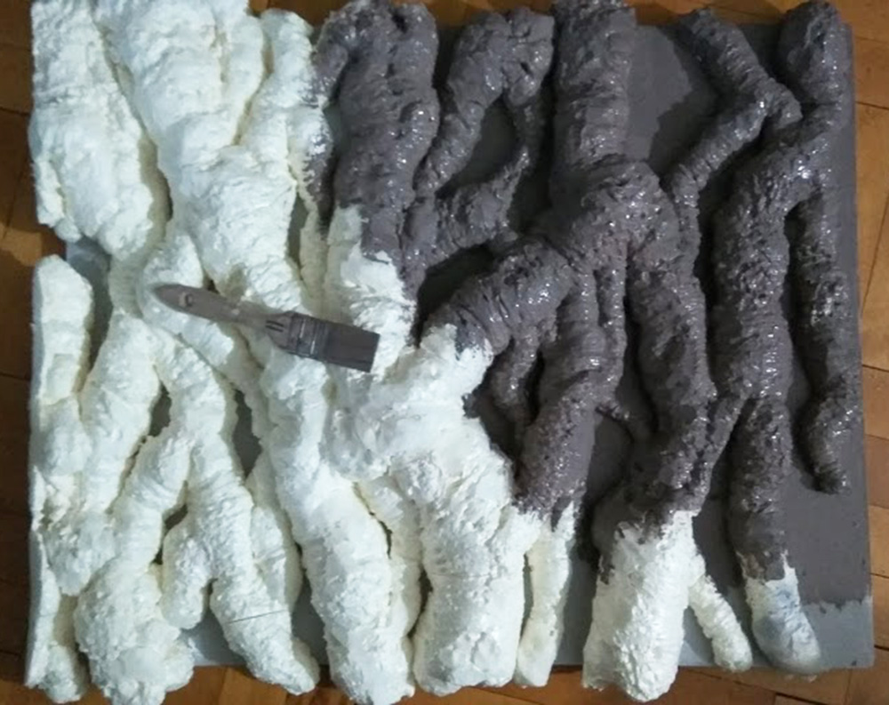 Піна на великій частині soudal з ковпачком-пістолетом. Дуже сподобалась у роботі - просто і легко створився малюнок коренів і плюс фактура класна вийшла. На меншу частину не вистачило, докупив, іншу, що попала під руку - результат не дуже потішив - лагала якоюсь стрічкою, важко було контролювати вихід. Ліпив руками і ножем.