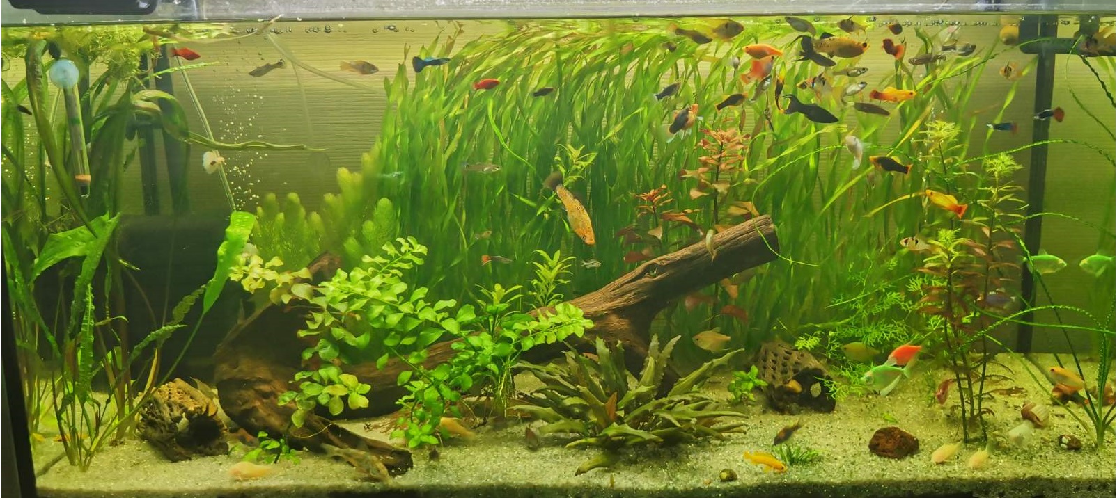 Запуск январь 2021, аквариум "Природа" на 220л. наружный фильтр, светильник RGB. Население; моллинезия, пецилия, коридорасы, креветки неокардины. Запускался на "Жывом грунте" из декораций коряги, лава, базальтовая крошка, жывые растения.