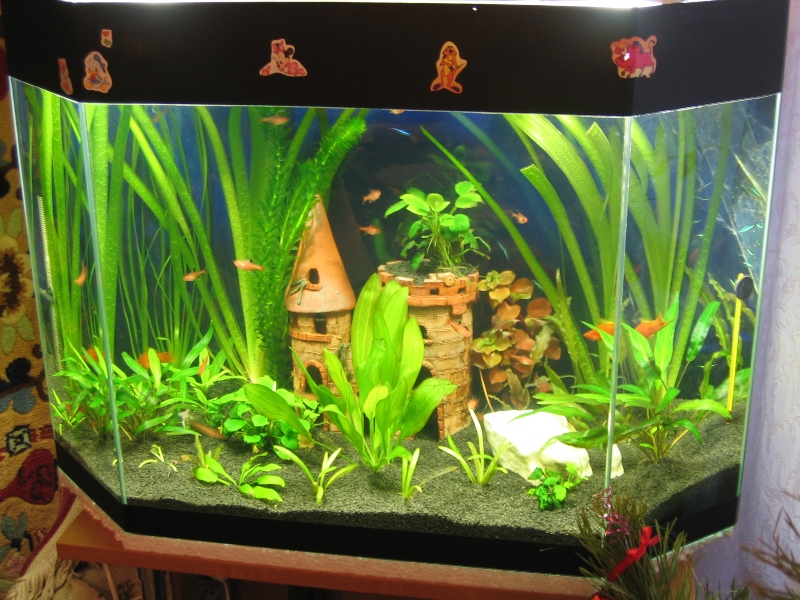 А мне нравится там замок! Удачно расположился, не навязчиво и с имеющимися рыбками вполне смотрится. Много ли приходилось видеть симпатичных аквариумов с замками? Нет!  Вот в этом и индивидуальность. И очень даже сочетается с наклейками из мультиков.