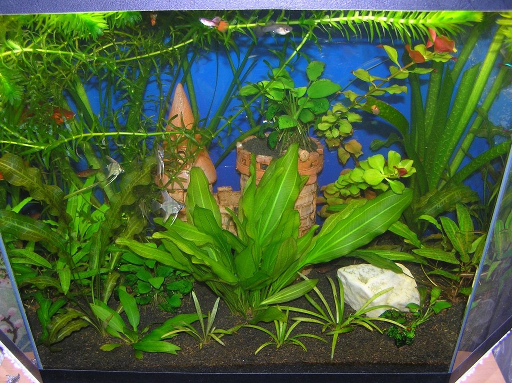 аквариум класс!видно что еще молодой, свеженький такой ,только запущенный.желаю вам Speedfire чтобы он подольше таким и оставался!а насчет замка не распыляйтесь-главное вам нравится и многим другим я думаю тоже,кстати рыбки (не крупные конечно) просто обожают такие вот "искуственные рифы".а советы с этими(во многом создающими проблемы)корягами и булыжниками немножечко уже достали.но самое главное что у вас много живых растений!