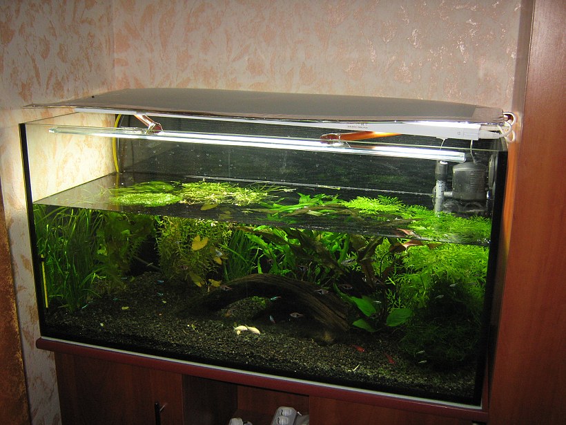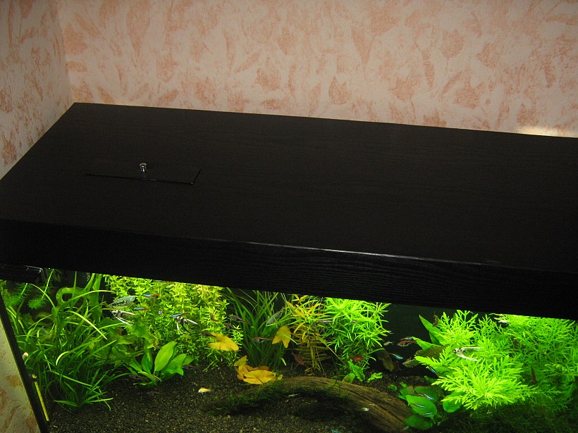 Несколько недель лампы (готовые светильники - 6 шт. Т5 китайские) - лежали на стяжках. Потом склеил крышку из панелей. Внутренний фильтр заменен на Флюваль. Стоит бражка, рано или поздно перейду на баллон. Удо пока не лью.
