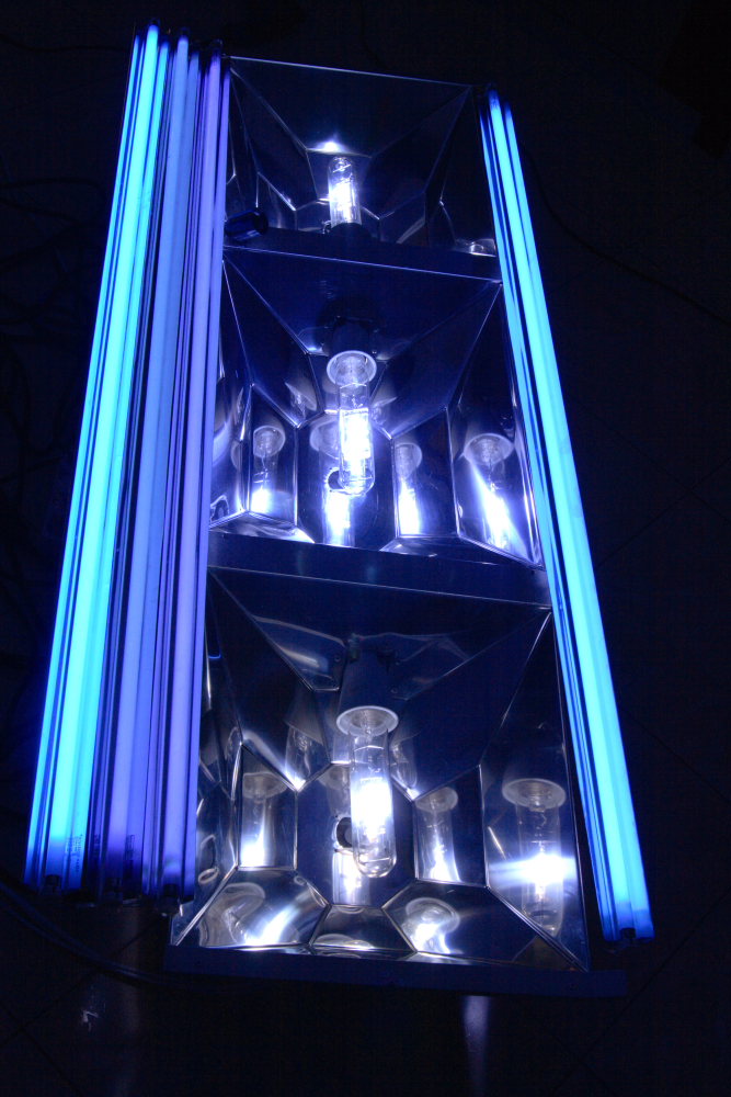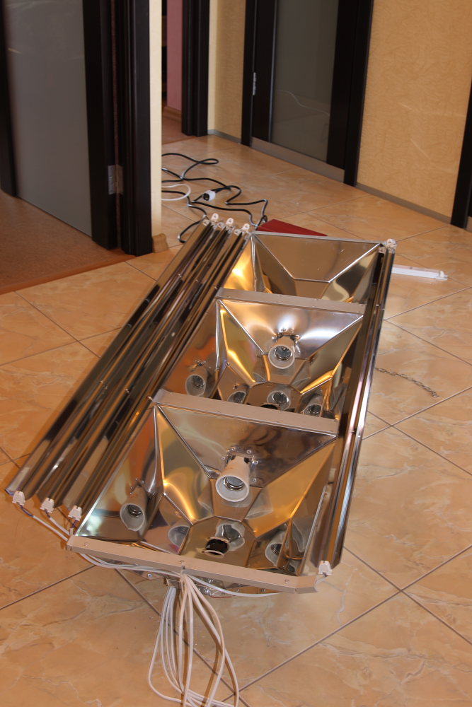 Общий размер светильника 1550х600. 2 отражателя по бокам под МГ250Вт. Всередине под 400 Вт. + 4 независимых отражателя под Т5.