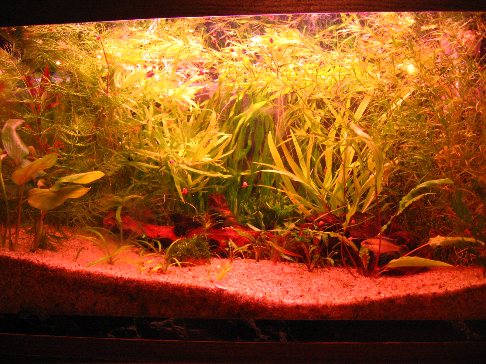 Вода была почти полностью слита(оставила около 0.5 см и немного грунта ), фильтр тоже не фистила. Затем был запарен на сутки торф (вода слита, ), торф был перемешен с Флораполом и выложен в акву, сверху посыпано углем. Затем насыпан грунт (гранитная крошка -опять таки спасибо KSO), положен ракушняк (был до этого в акве) и коряжка (купила мопани-обвязала мохом). Высажены заново растения, залита вода. Вот что получилось...Мопани сильно закрасила воду и сейчас принимает ванны в бочке-дальше будет видно. Лампы были заменены на 2 Гролюкс 15 Ватт. Добавлен по инструкции Ферропол. Свет включался 1 и 2 день-на 2 часа, 2 и 3 день на 3 часа, 4 и 5 день на 4 часа, 5 и 6 день на 6 часов. То что получилось на фото, из проблемм что появились-нитчатка (думаю что удо надо было добавлять не сразу). Проведенные мероприятия-замена 60% воды, без добавления ферропола, сокращения длительности светового дня до 2 часов в сутки. Ждемс.. Предложения и конструктивная критика приветствуются )))