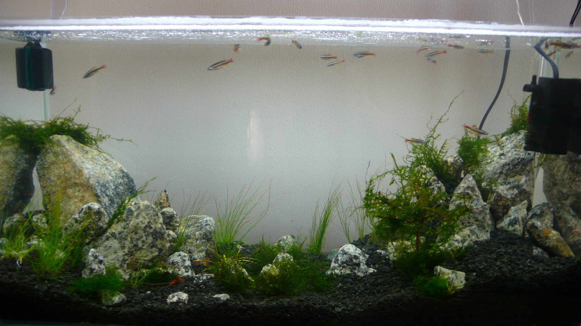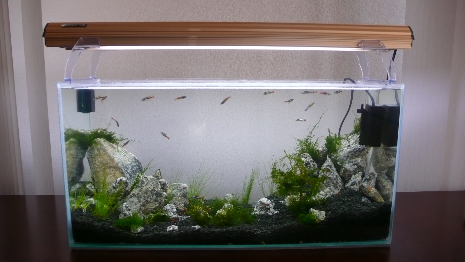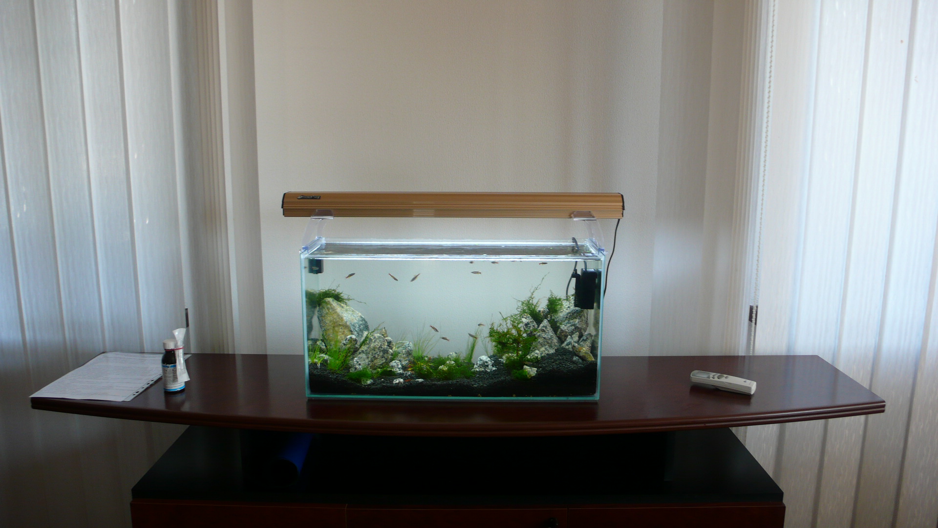 Аквариум запускался с 0 за 1,5 часа, с целью свести уход от минимума до совсем минимума, использовала только мхи и неприхотливый вид рыб.