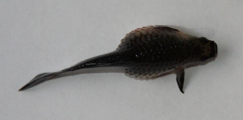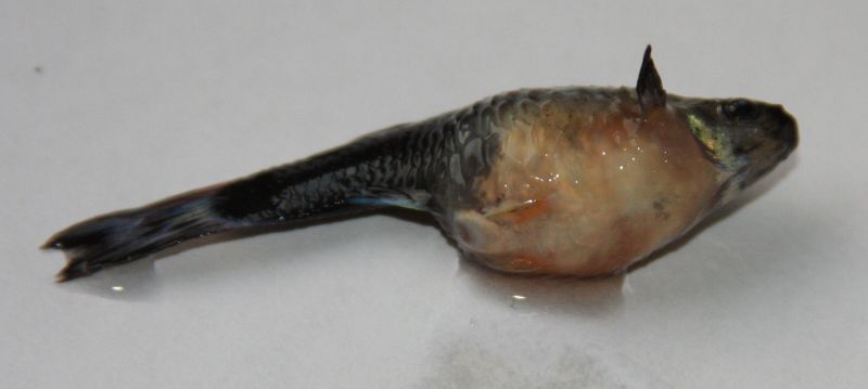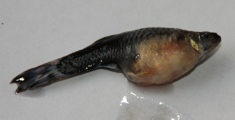 Эта рыба сегодня днем умерла. Чешуя ерошилась уже по всем бокам. Рот рыбы после смерти слегка приоткрыт. После пересадки рыба сильно побледнела, но через пару часов цвет вернулся в обычное состояние, таким до смерти и остался. Фото посмертные.