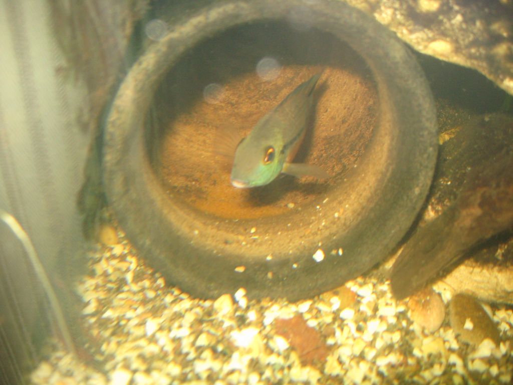 Прошел почти месяц. Самка все так же бледная, скорее даже серая, живет под корягой. Самец немного активизировался, но еще с ненормальной окраской. Молодая самочка из подсаженных активно подбивает клинья к самцу, приглашает его в горшок. Он пока не сильно ведется, но и не гонит. Может сформируется новая пара. Но все равно старожилы мне внешне не нравятся совершенно.