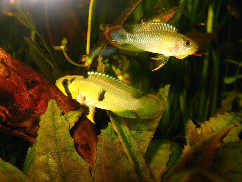 Насчет соседей - лучше мелочь харациновую и т.п. Рыбки, в отличие от других карликовых цихлид, пусть и таких же молодых, пока очень скромно себя ведут, не в состоянии дать отпор даже рамирезкам. Самка понаглее, самец совсем тихий. Думаю, что это временно, конечно.