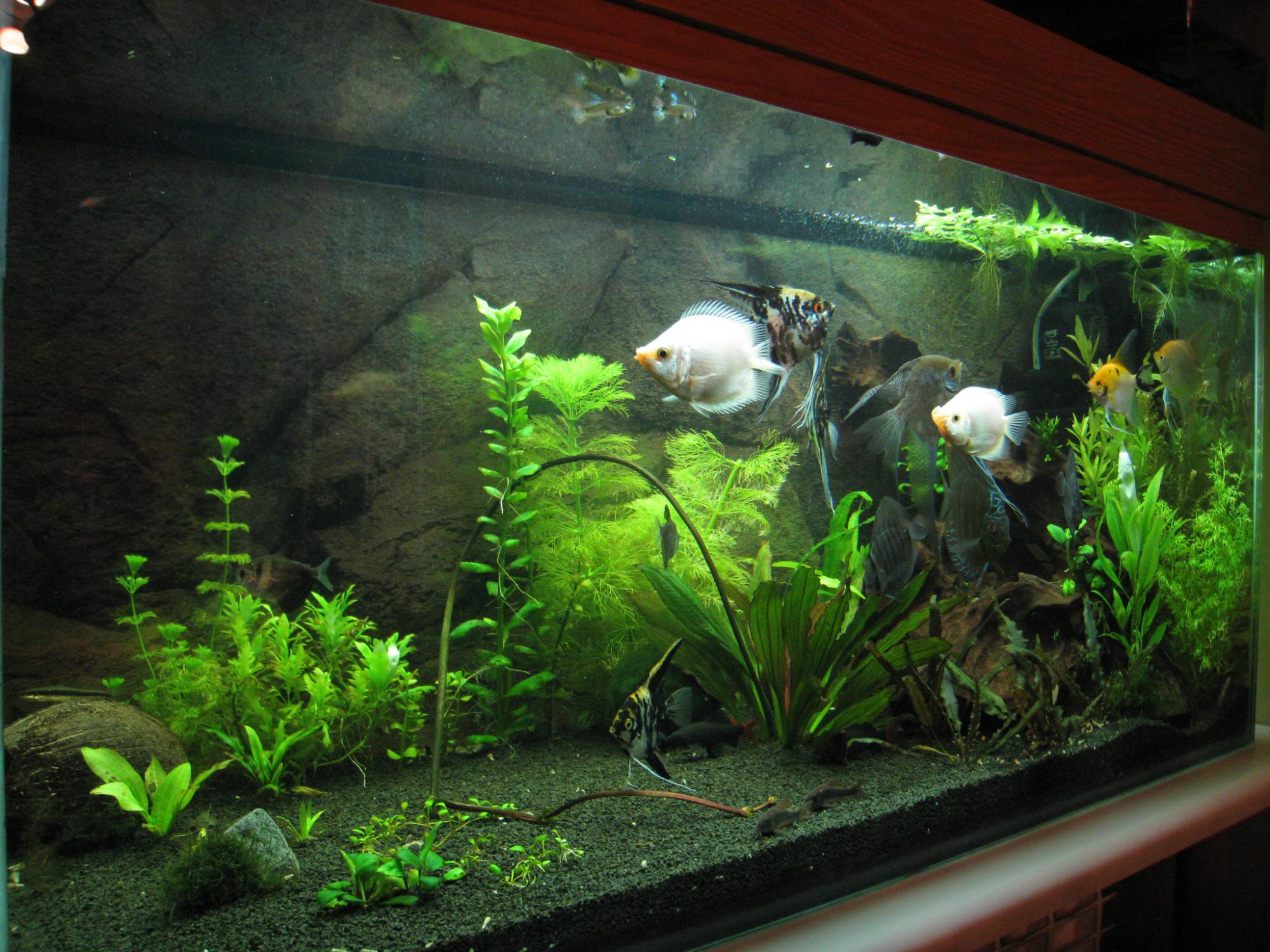 Красиво получилось: темный фон и грунт делают зелень и рыб намного ярче! Очень хорошо, спокойный такой аквариум. Если зелень еще разрастется, то можно будет телек продать