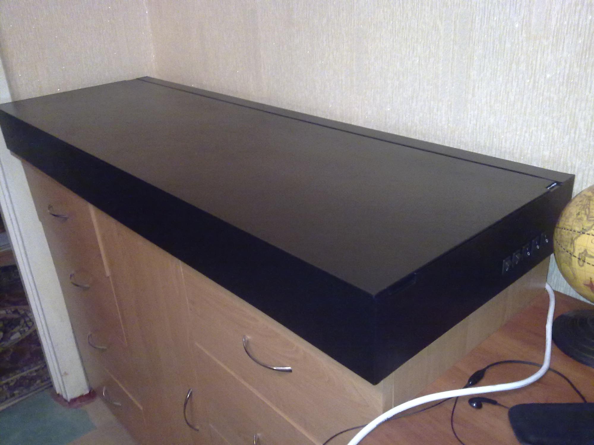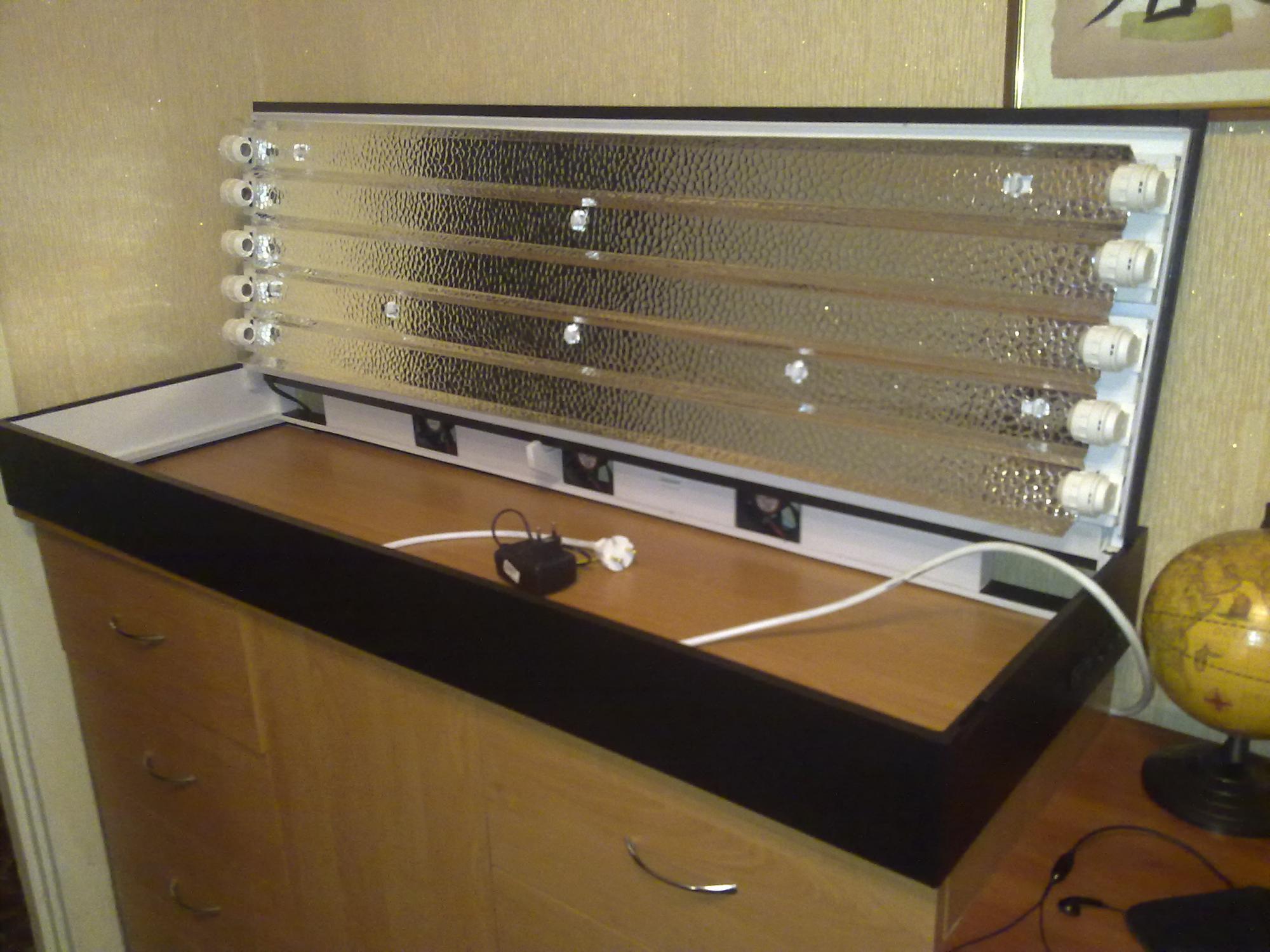 Lugansk. Предлагаю для Вас следующую конструкцию крышки (не открытые светильники, и даже не навесной, потому-что за шторкой должно быть темно): поднимающийся верх, но не весь, а только на 2/3; от бытовых светильников под крышкой (увы!) придется отказаться (самый верхний в нише пусть остается на месте, он осветит и полку, и всю нишу для работы, а вкл. для него есть отдельный) и применить гермопатроны; если интересует вентиляция, то куллеры нужно встраивать в верхнюю плоскость крышки ближе к задней стенке.