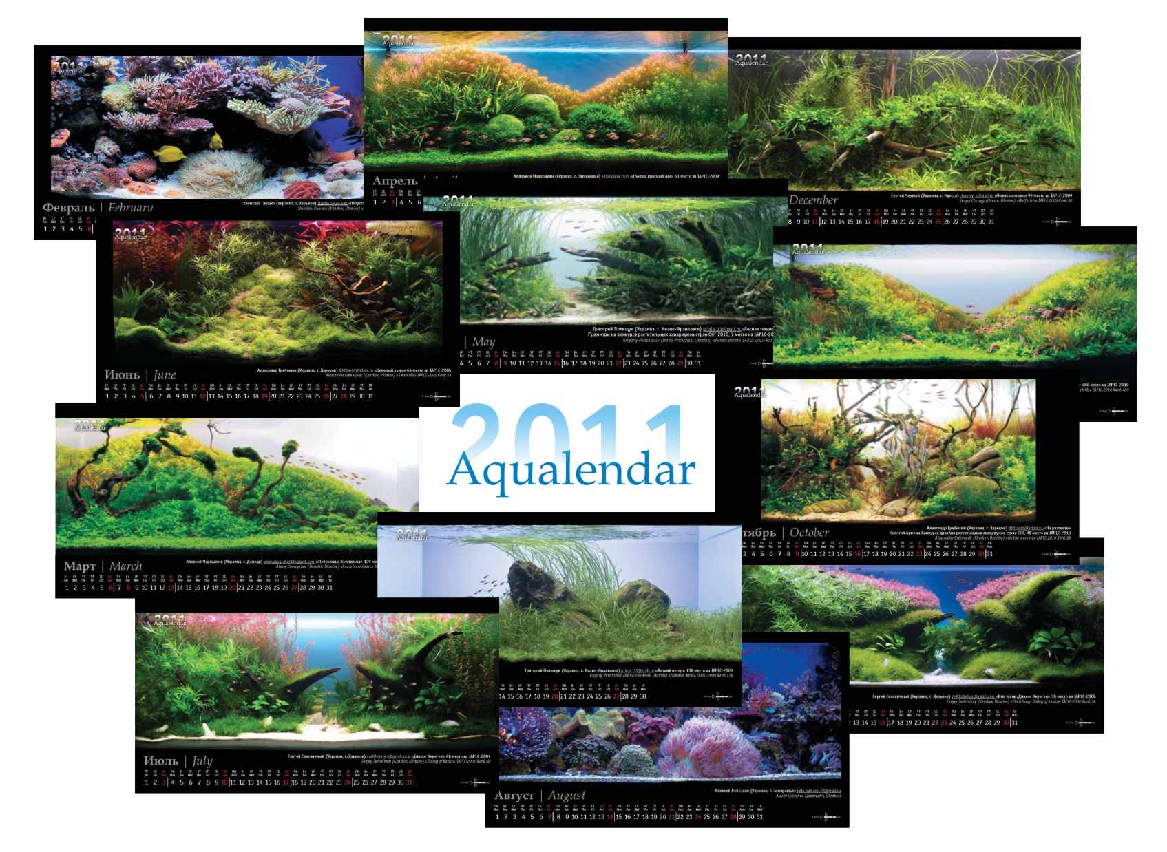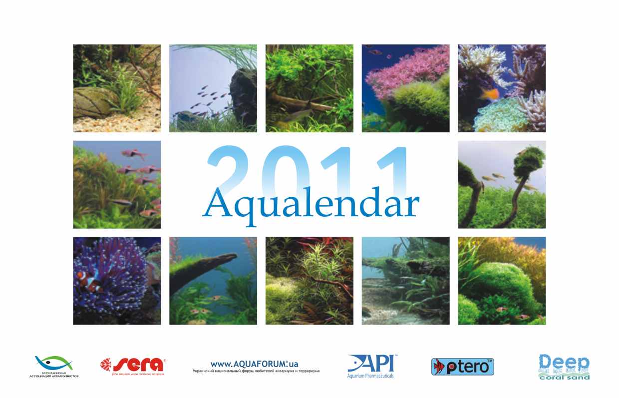 Впервые выпускается календарь, в который включены работы лучших аквадизайнеров Украины. Большинство фотографий аквариумов, вошедших в него, были представлены на международных конкурсах и получили высокие оценки жюри. Работы Григория Полищука (aka GrinjA) и Александра Гребенюка (aka ikhtiandr) заняли два первых места в Конкурсе дизайна растительных аквариумов стран СНГ 2010. В Аквакалендарь2011 также вошли фото пресноводных аквариумов Сергея Светличного (aka Mogicanin), Иллариона Макарихина (aka Borman), Сергея Черного (aka Чесник), Алексея Чернышова, также в календаре представлены и “моряки” Станислав Глушко (aka stas Alpin) и Алексей Лозбенев (***шерхан***).