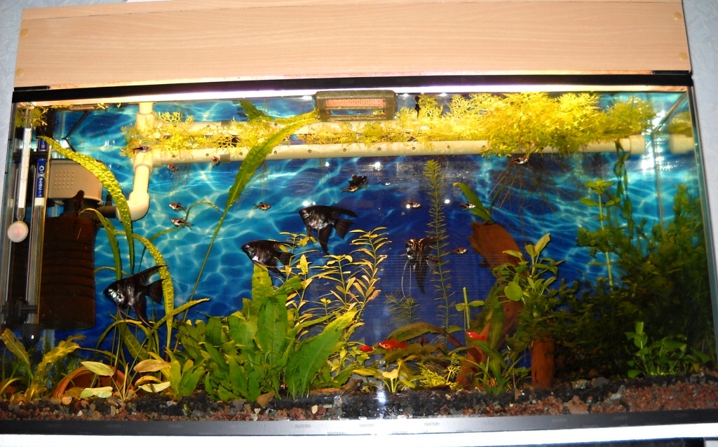 Флейту давно уже сделал и запустил. Кому интересно - вот фото. Сейчас флейту практически не видно - заросла папоротником. Польза от использования флейты-дождевалки огромная, без нее от фильтра ложится вся растительность - куда-бы не направлял струю (1200л/ч на 100 литров), а так движение воды плавное и почти не заметное.